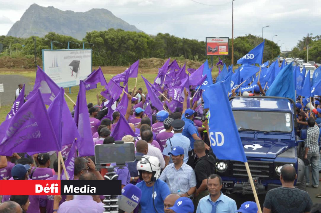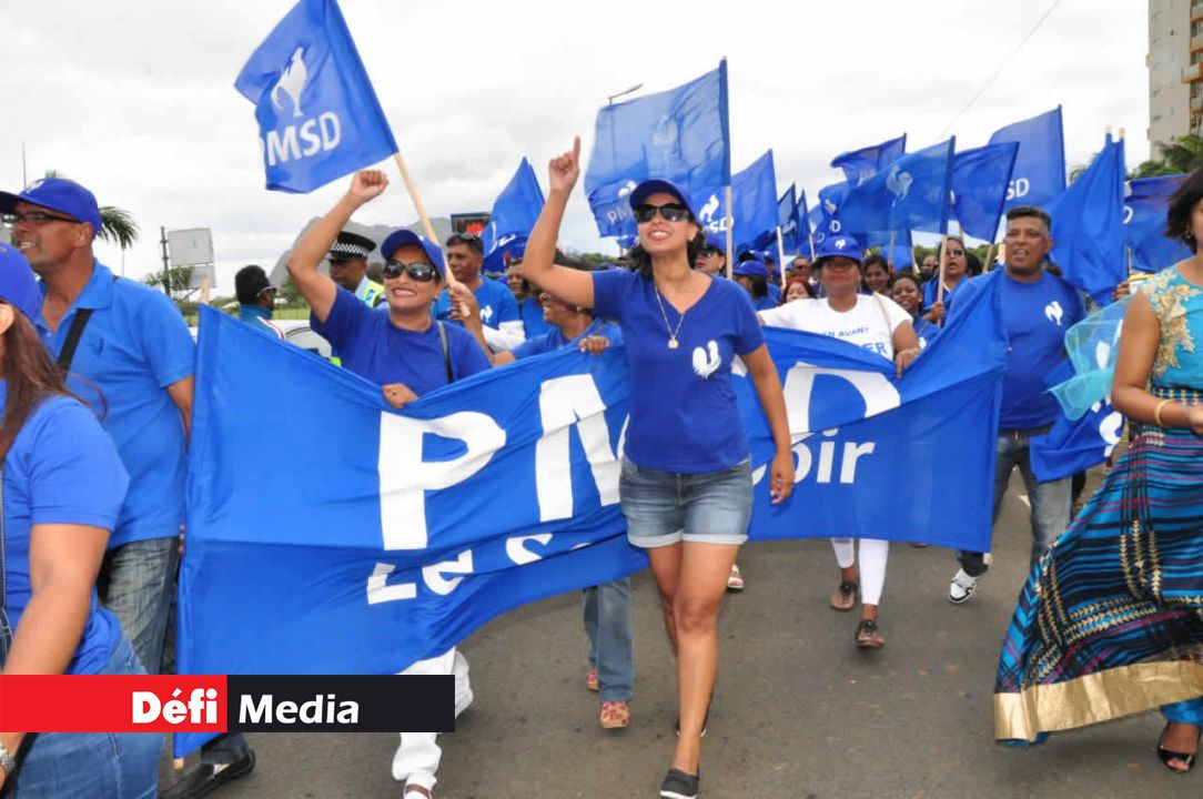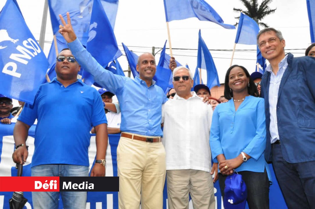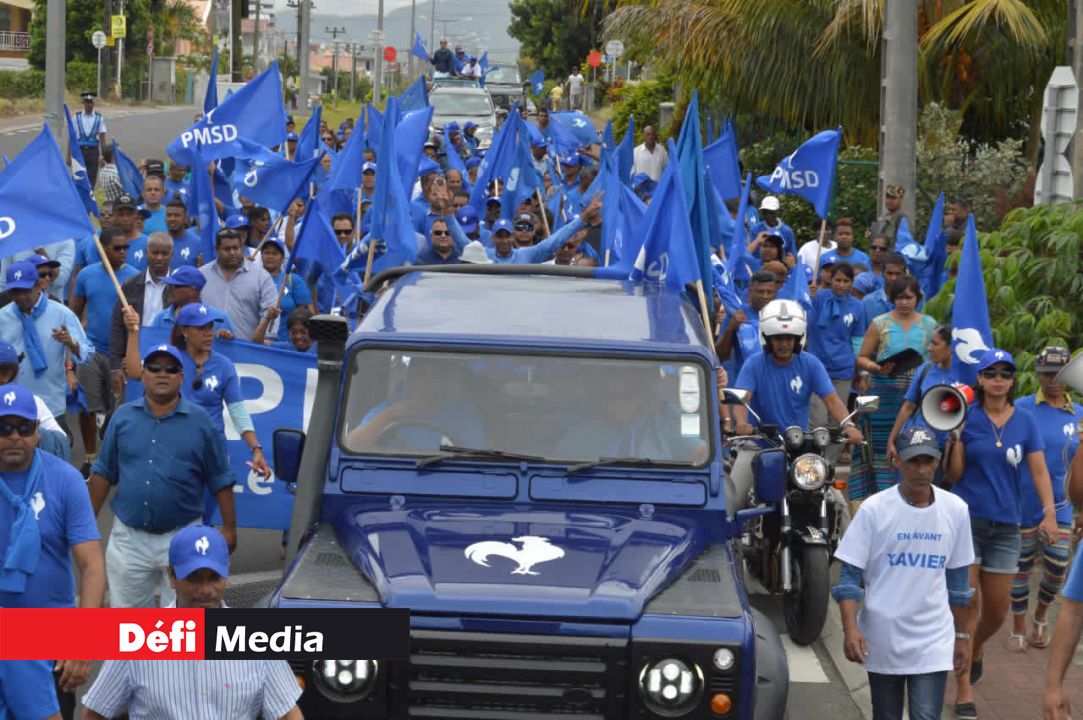 Le Parti mauricien social-démocrate (PMSD), qui a pour candidat Dhanesh Maraye, a emboîté le pas au MMM. Le parti a sorti le grand jeu. Deux motards de la police roulaient devant le cortège composé d’une dizaine de voitures… Assis sur les portières, les partisans bleus portant l’emblème du coq scandaient le nom du candidat à la partielle.