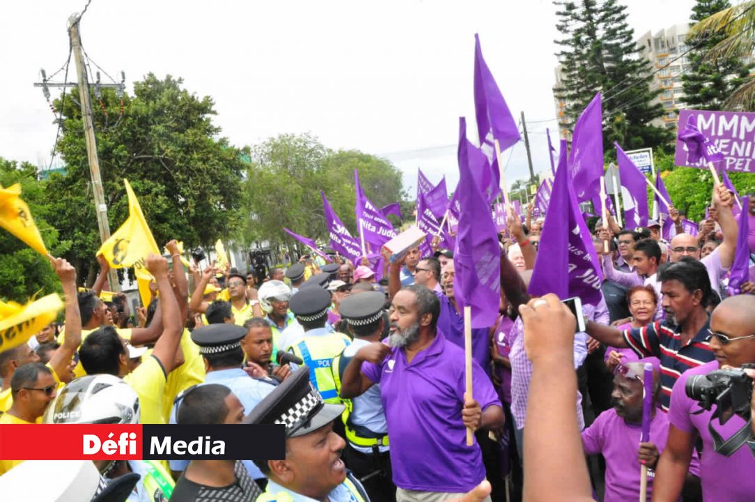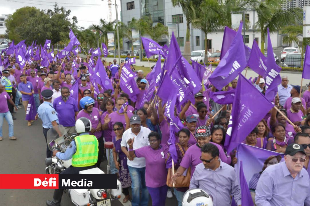 Une trentaine de minutes plus tard, les partisans du Mouvement militant mauricien (MMM) sont arrivés. T-shirts, casquettes et même parapluies… Le mauve emblématique du parti prédominait. Dans la foule, des voix féminines stridentes lançaient en boucle : « Ki nou vote ? Nita ! Ki nou vote ? Nita ! » Les partisans du MMM étaient certes dépourvus d’instruments à percussion mais ils sont néanmoins parvenus à « met tchoula ».