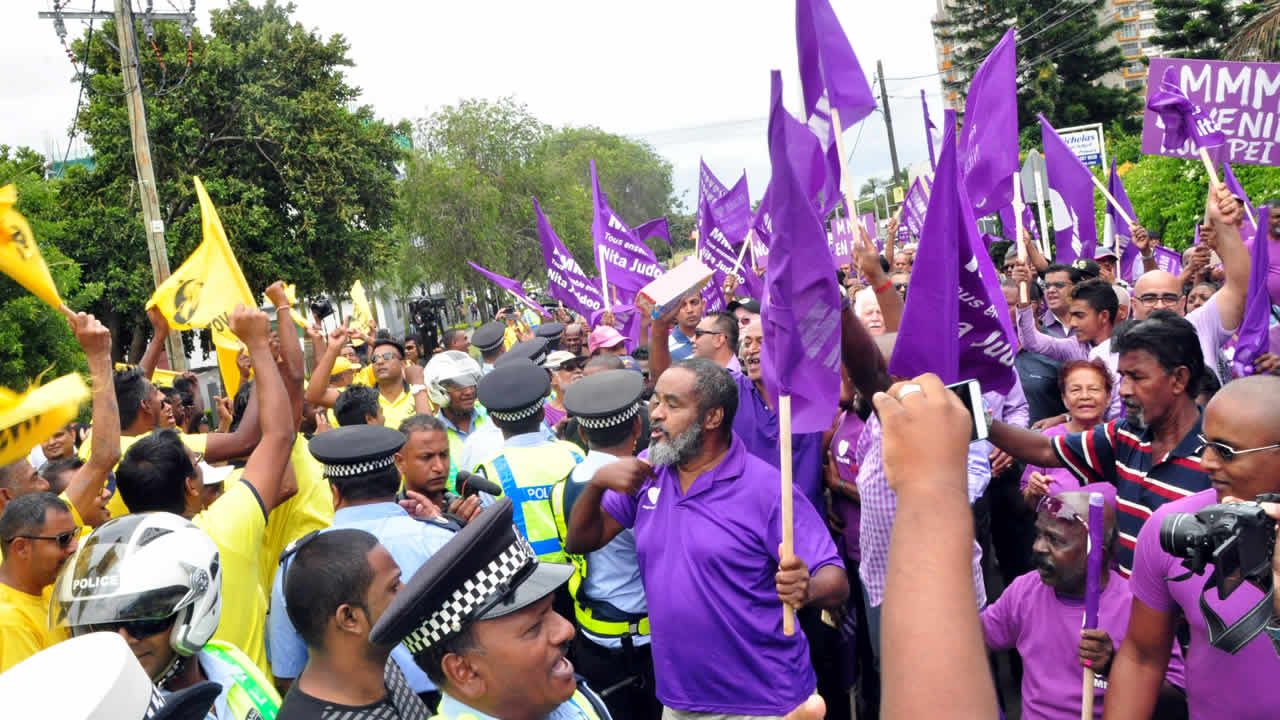 Scène inédite samedi, vers 11 heures, à 200 mètres du Sodnac SSS, lorsque des partisans du Mouvement militant mauricien (MMM) et ceux du Reform Party se sont croisés à la Sodnac Link Road. Alors que les sympathisants de Roshi Bhadain scandaient le nom de ce dernier, les mauves clamaient, de leur côté, celui de Nita Juddoo. Aucun incident n’est à déplorer, mais au moment où les deux partis se sont rencontrés, des policiers et des motards se sont placés au beau milieu de la route, pour s’interposer entre les deux camps. Quarante-cinq minutes plus tard, les supporters du MMM ont croisé ceux du Parti mauricien social-démocrate en quittant le collège.