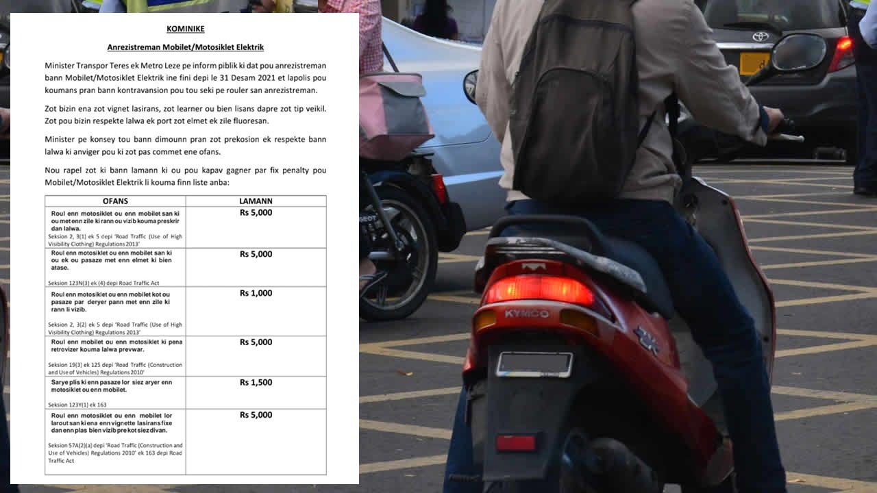 Non-enregistrement des mobylettes et motocyclettes électriques : une « fixed penalty» de Rs 1 000 à Rs 5 000