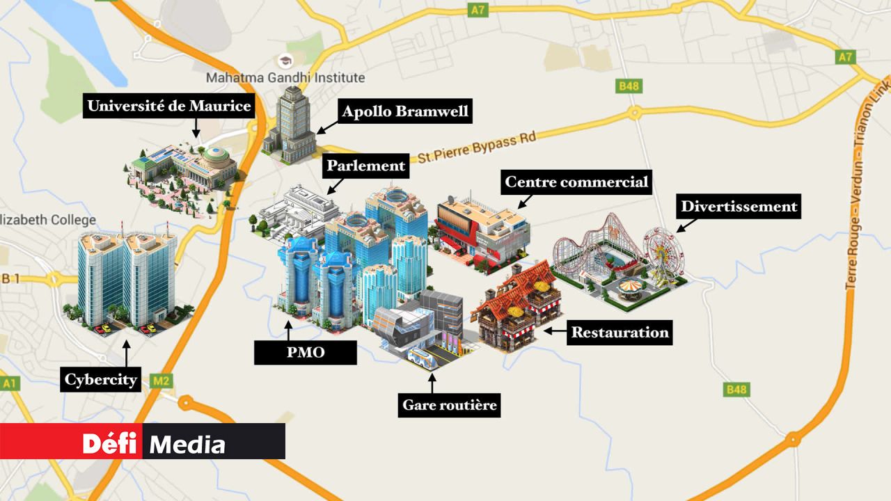 Le site identifié, qui s’étale sur 336 arpents, se situe juste à côté du triangle d’Ébène, au Sud d’Apollo Bramwell. Lors d’une courte présentation vidéo, Roshi Bhadain a expliqué que le Parlement, le Bureau du Premier ministre et huit ministères importants y emménageront. Les ministères seront aménagés dans des tours que le ministre a décrites comme des « iconic buildings ». Il s’agit en fait de bâtiments au design impressionnant qu’on trouve à Dubayy.