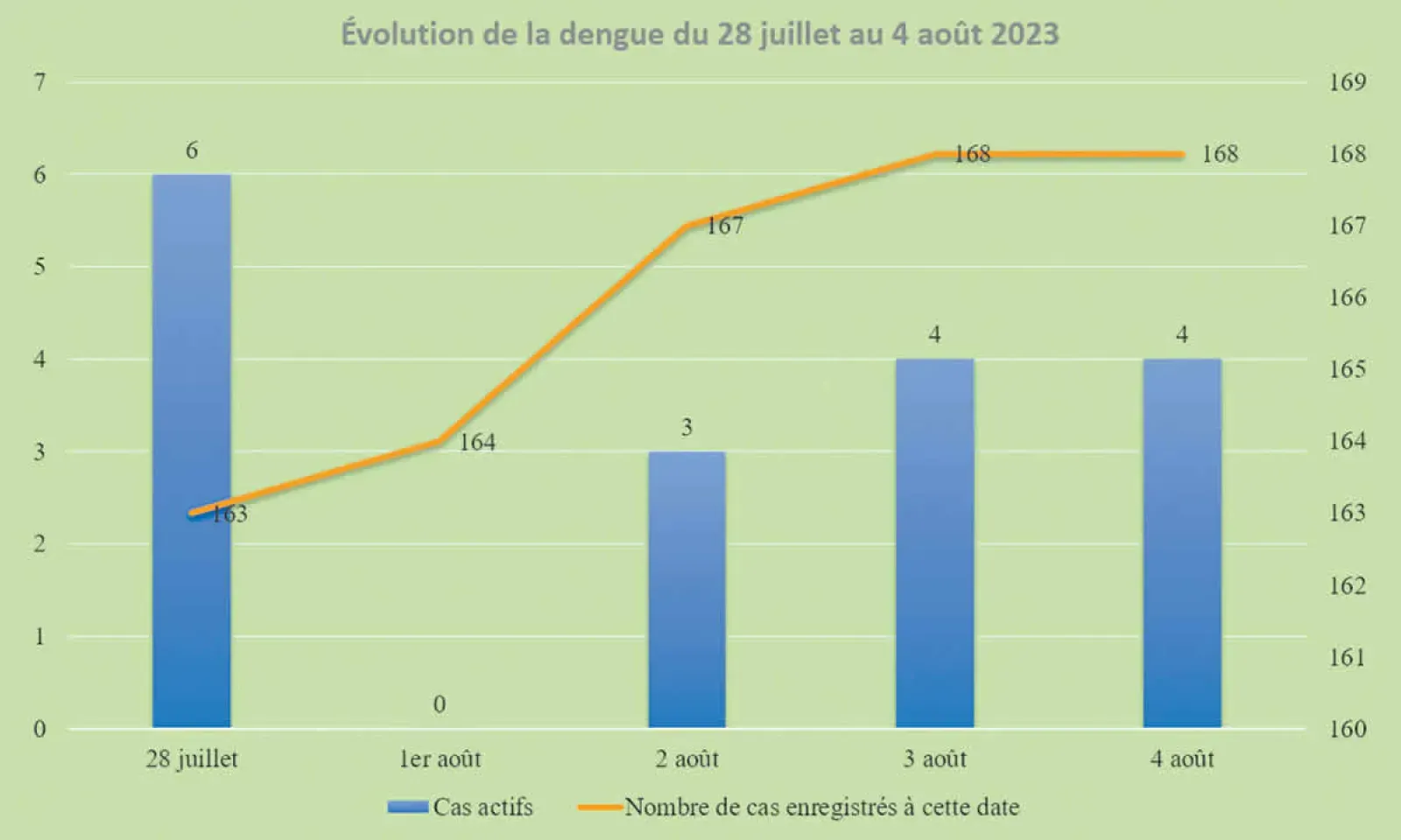 Le répit aura été de courte durée. Si l’espoir était permis face à l’absence de nouveaux cas de dengue entre le 26 juillet et le 1er août 2023, il s’est toutefois évanoui. Dans un communiqué émis le 2 août, il est indiqué que trois nouveaux patients l’ont contracté. Au 4 août, le nombre de cas actifs s’élevait à quatre, portant le total à 168 cas enregistrés depuis l’éclatement de l’épidémie, le 3 juin.