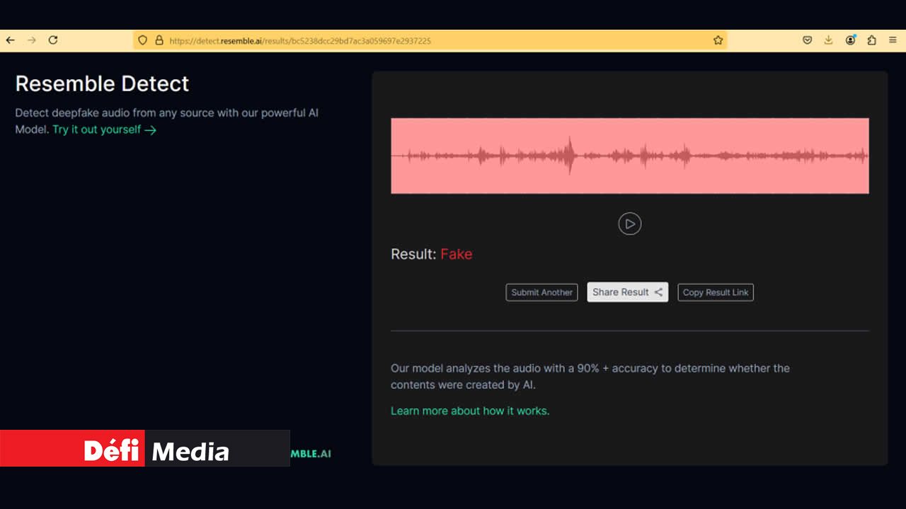 Mais les voix semblent robotisées. Pour en avoir le cœur net, Le Défi Quotidien a passé la bande sonore dans un service en ligne de détection de deepfake, detect.resemble.ai. Le résultat est sans appel : la bande sonore est fausse.