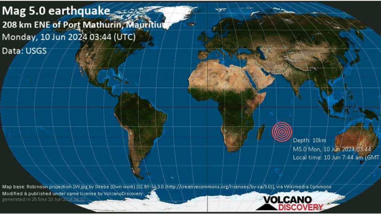 Le tremblement de terre avait une profondeur très faible de 10 km. Une très faible secousse a été ressentie à Rodrigues, selon le site Volcanodiscovery.com.