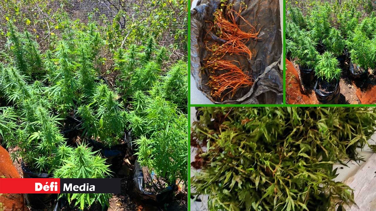 À Rodrigues, deux plants ont été retrouvés chez Marie Suzanne Louis, alias Kursline, 33 ans, à Soupirs. Un habitant du même village, Jean Joseph Étienne Momus, dit Tito, 19 ans, a été arrêté avec un plant et 12 semences. Un certain Amane Louis, 19 ans, a également été interpellé avec un plant.