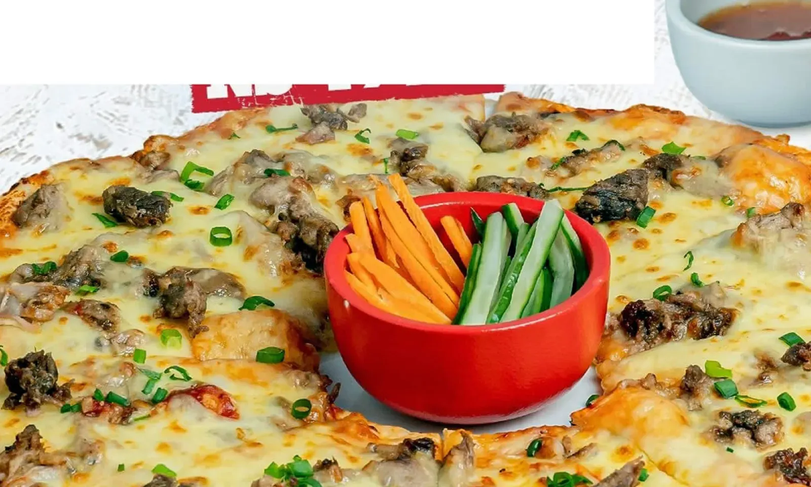 Les morceaux de canard laqué et d’autres ingrédients traditionnels sont étalés sur la pâte à pizza. Elle est servie avec un bol de légumes coupés en julienne comme la carotte et le concombre. Ainsi qu’une sauce qui complémente le tout, indique-t-il.