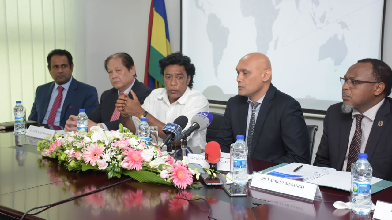Le représentant de l'Organisation mondiale de la santé (OMS), Laurent Musango, Sun Gongyi, ambassadeur de Chine à Maurice, et Somas Appavou, Chief Executive Officer d'Air Mauritius, étaient également présents lors de cette conférence de presse.
