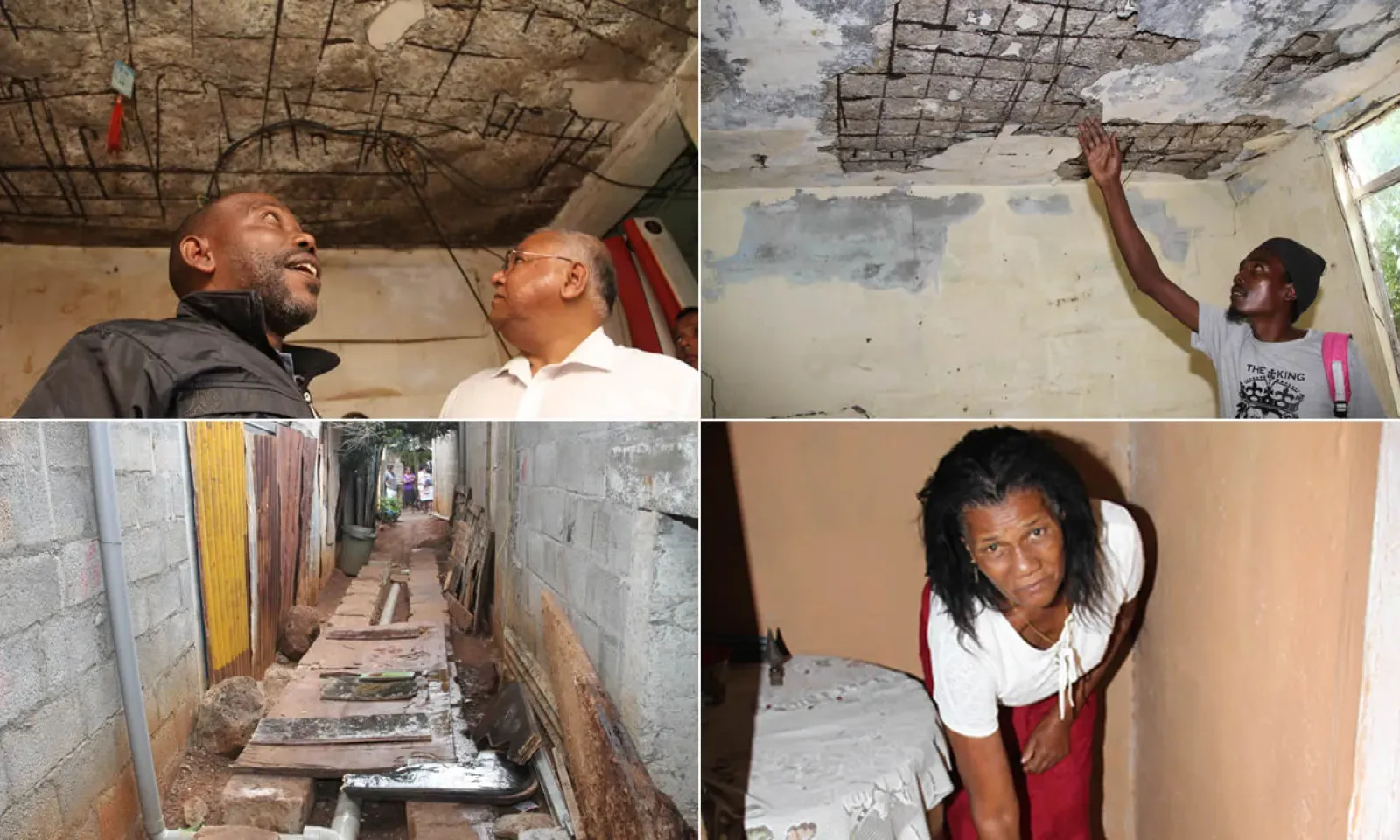 La dalle de leurs logis fout le camp. Les fers, qui ont pour fonction de soutenir la dalle, ont fait péter le crépissage laissant transparaître le canevas des barres de fer qui risquent à tout moment de s’affaler. Le ministre du Logement et des terres Mahen Jhugroo, en a pris note lors d’une visite des lieux. Il a promis de tout faire pour remédier à cette situation qui donne le frisson et un mal de tête fou.