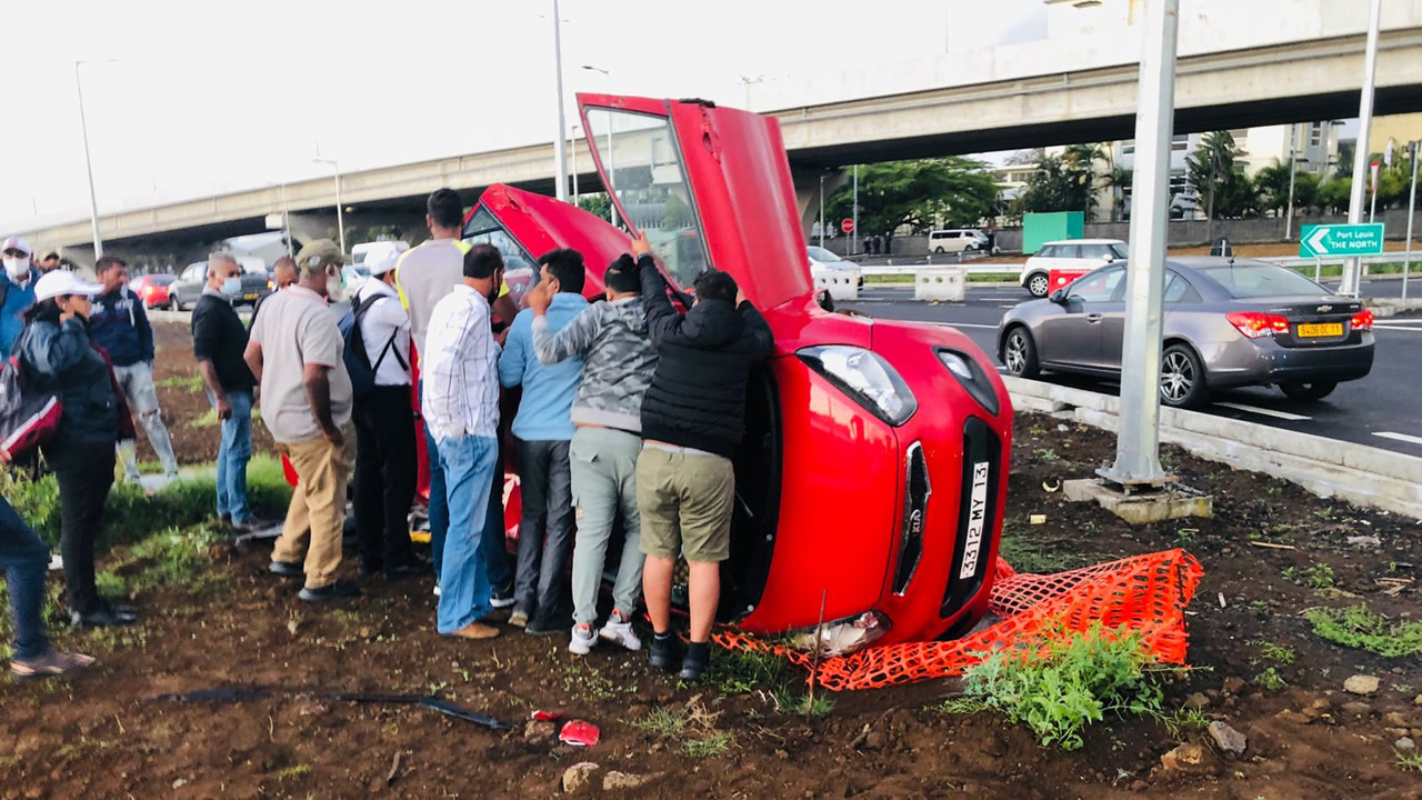 Une voiture qui a mal négocié un croisement à Phoenix a terminé sa course sur le nouveau rond-point de Phoenix samedi après-midi. La citadine a fait un tonneau avant d'atterrir les roues en sens dessus dessous. La police a été mandée sur les lieux. Des volontaires ont aidé à extirper le conducteur du véhicule. Blessé, il a été transporté à l'hôpital.