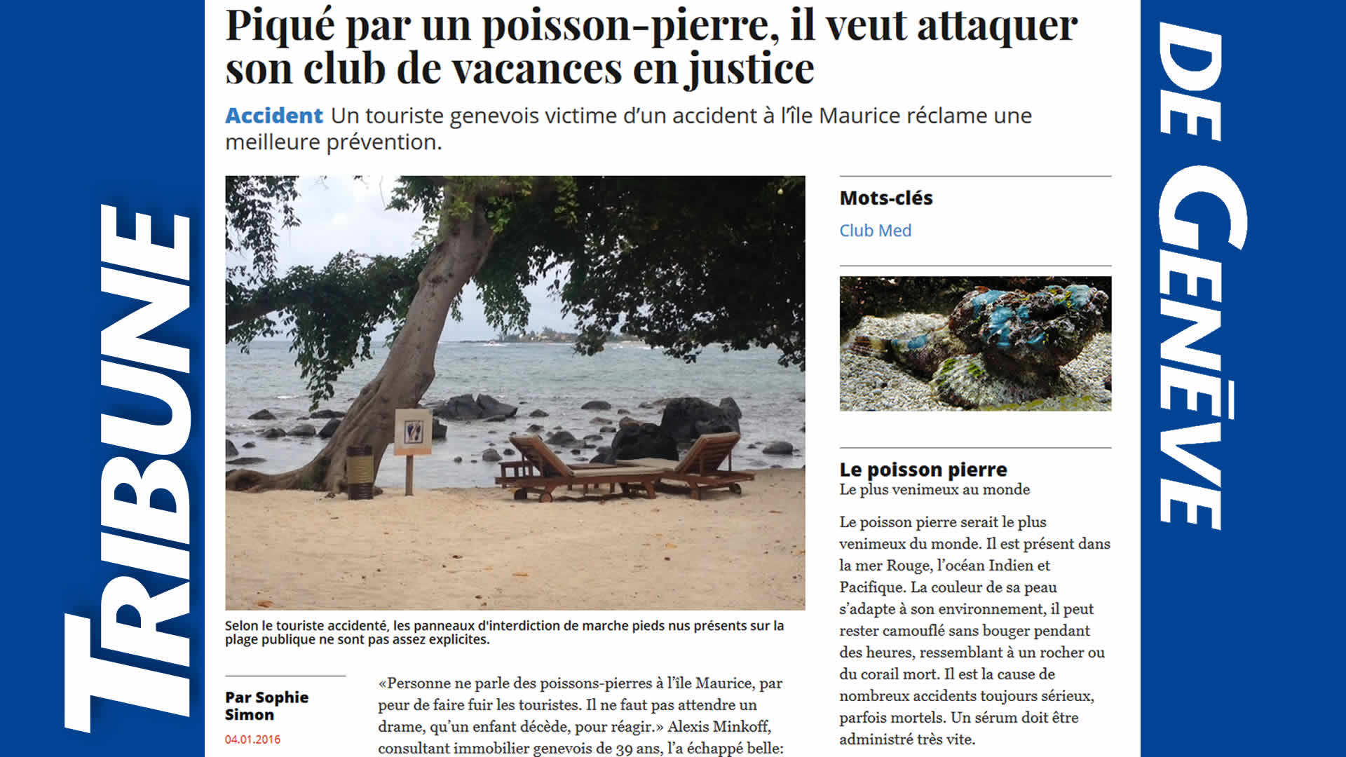 « C’est la deuxième fois qu’un tel cas se produit depuis l’ouverture de ce club il y a huit ans. Il y a une conférence d’information au village le jour même de l’arrivée des clients, qui les avertit de ce type de dangers. Mais on ne peut pas les forcer à y assister. De plus il existe plusieurs panneaux d’avertissement sur la plage, qui interdisent de marcher pieds nus », indique-t-il à la Tribune de Genève.