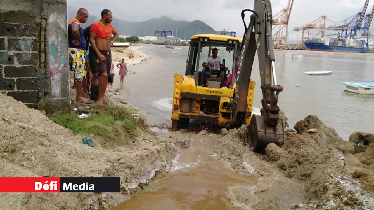 Les employés du conseil de district de Pamplemousses sont à pied d’œuvre à Baie-du-Tombeau pour évacuer l’eau. Le village côtier est la région la plus touchée par les intempéries et plusieurs quartiers ont été inondés.