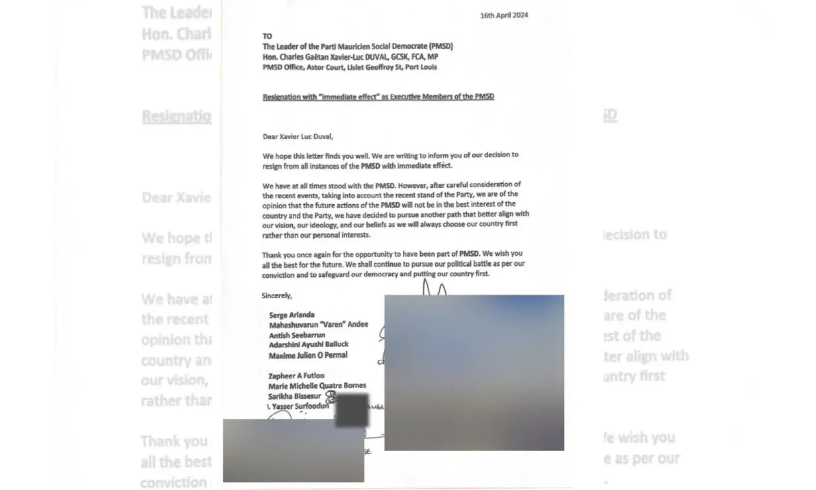 Après les députés Richard Duval et Khushal Lobine, ainsi que l'avocat Rouben Mooroongapillay, neuf autres membres du PMSD ont décidé de quitter la basse-cour bleue ce mardi 16 avril. Voici les noms des neuf démissionnaires ainsi que leur lettre de démission.