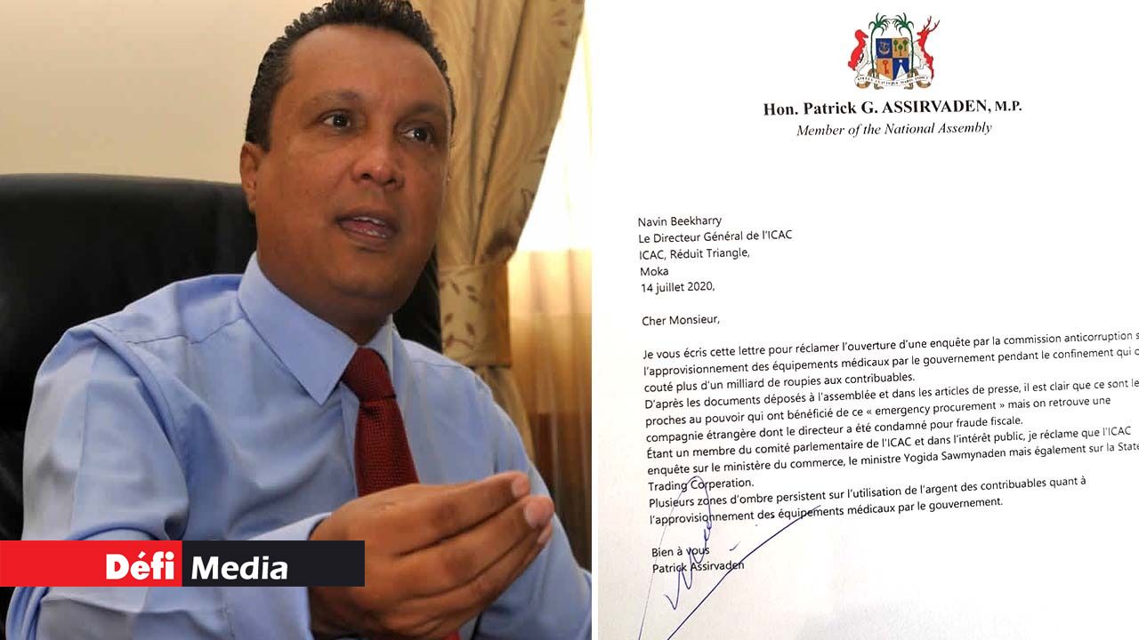 Dans une lettre adressée au directeur général de la commission anticorruption (Icac), ce mardi 14 juillet, Patrick Assirvaden lui réclame l’ouverture d’une enquête sur les conditions d'approvisionnement des équipements médicaux par le gouvernement pendant le confinement. Approvisionnement, qui a coûté plus d’un milliard de roupies aux contribuables.