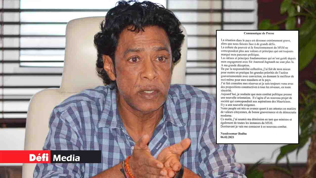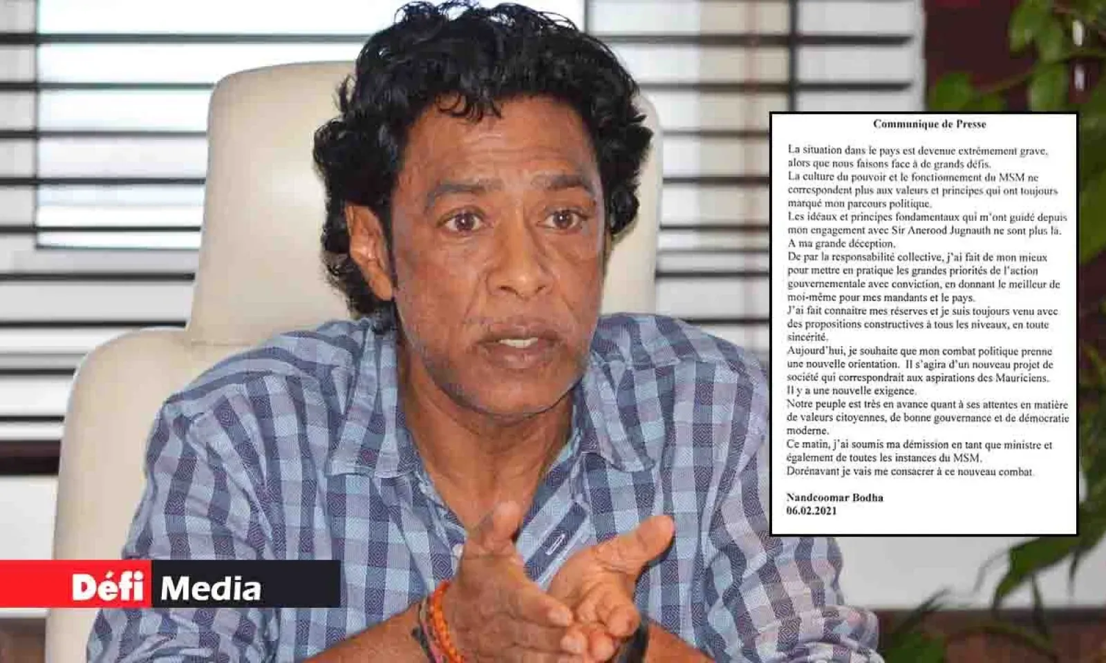 Nando Bodha a soumis ce samedi 6 février 2021 sa démission en tant que ministre des Affaires étrangères et membre du MSM.