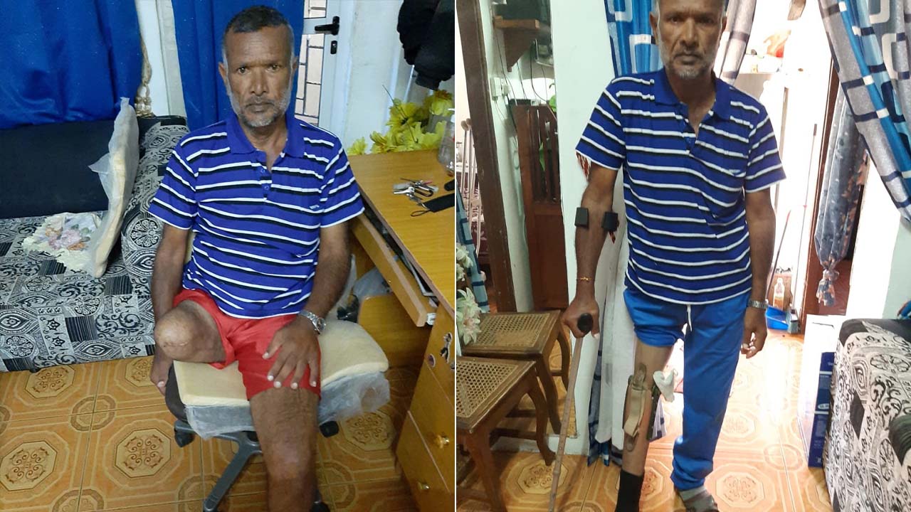 Poochandsing Parmessur a été amputé à partir du fémur droit. Il a passé neuf mois sur un lit d’hôpital et quand il est rentré chez lui, sa femme l’a abandonné.