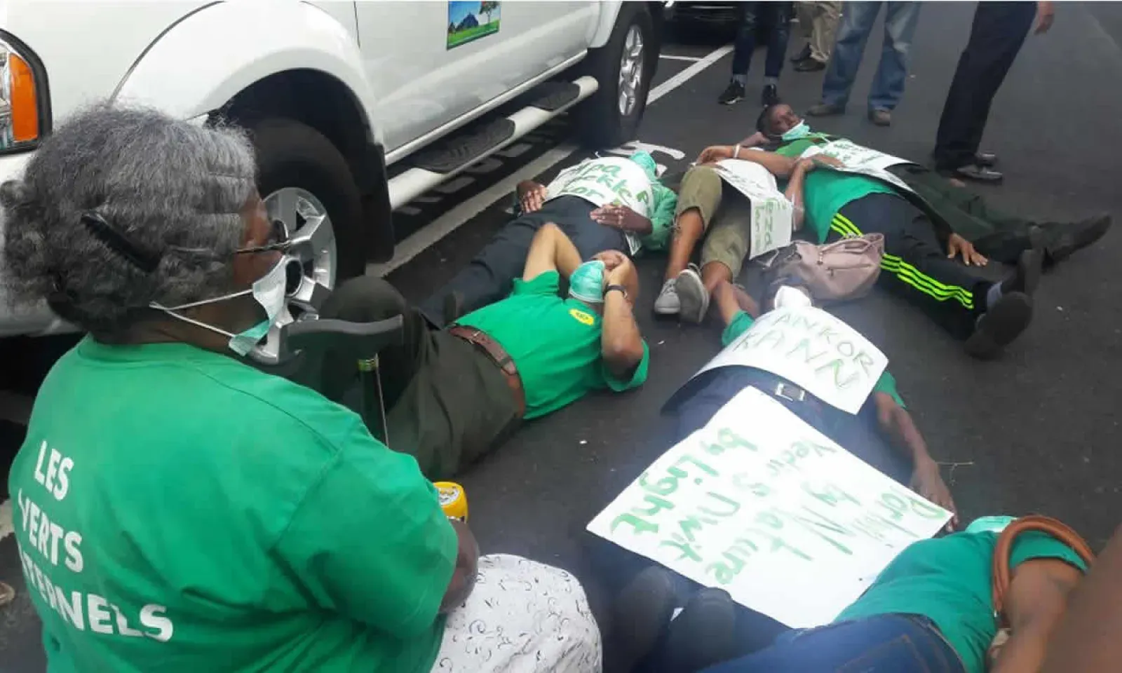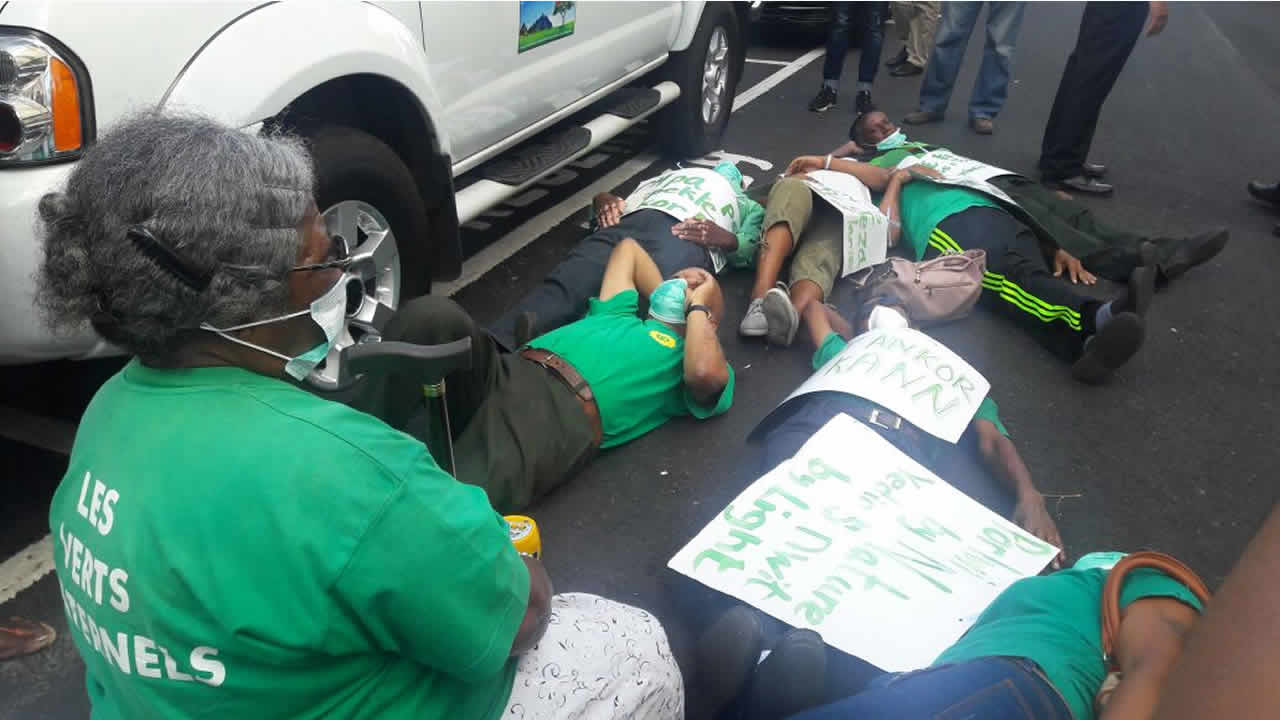 Pour protester contre le festival Porlwi by Nature, des membres du parti les Verts fraternels se sont allongés sur l’asphalte ce lundi 27 novembre devant le siège du ministère de l’Environnement à Port-Louis. Ils avaient auparavant effectué une marche pacifique dans les rues de la capitale.