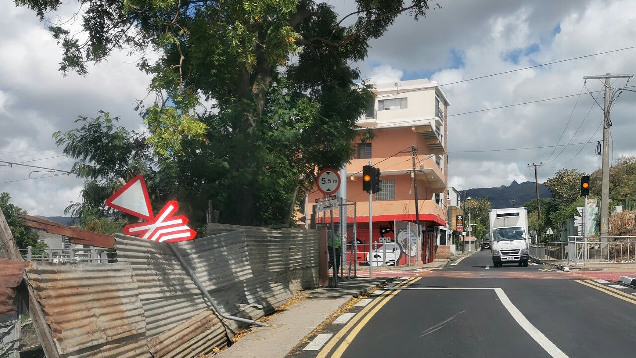 Ce panneau de signalisation annonçant le passage à niveau du chemin de fer à rue Monseigneur Leen, Port-Louis, ne tient plus que par des feuilles de tôle en bordure de la route. Ce panneau a été abîmé dans un récent accident et il attend toujours d’être réparé.