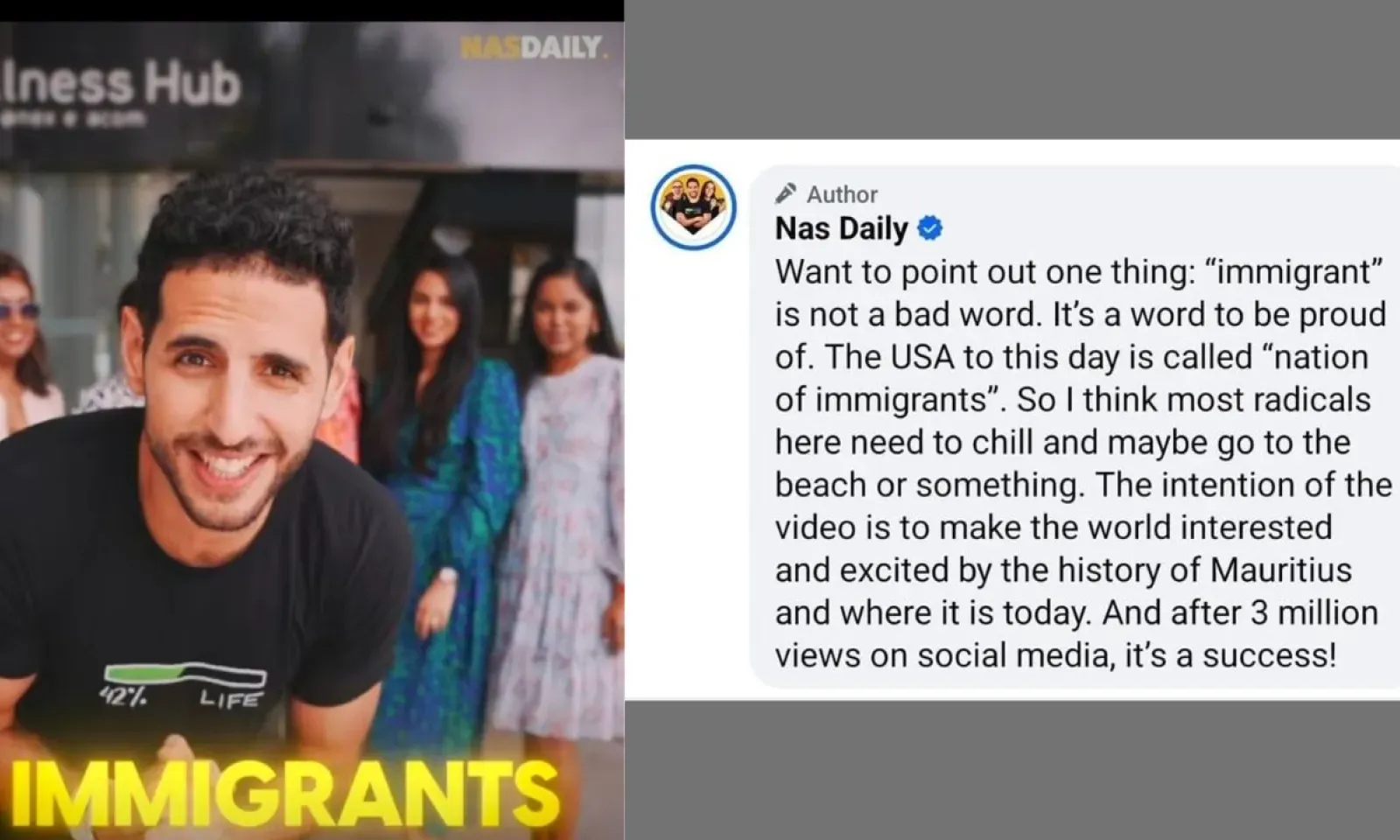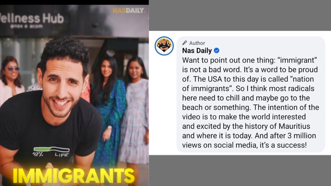 Face à l’ampleur des critiques, Nas Daily a tenté de se défendre. Il a expliqué en commentaire : « Je tiens à souligner une chose : le mot ‘immigré’ n’est pas un gros mot. C’est un mot dont on peut être fier. Aujourd’hui encore, les États-Unis sont appelés « nation d’immigrants ». Je pense donc que la plupart des radicaux ont besoin de se calmer et d’aller à la plage. L’objectif de la vidéo est de susciter l’intérêt et l’enthousiasme du monde entier pour l’histoire de l’île Maurice et ce qu’elle est devenue aujourd’hui. Et après 3 millions de vues sur les réseaux sociaux, c’est un succès ! ».