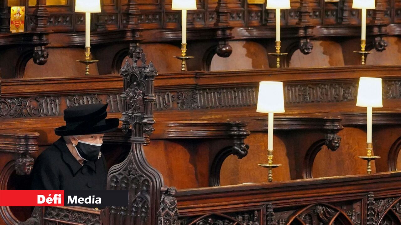 Image marquante de la cérémonie, la reine était assise seule sur un banc de la chapelle, le visage couvert d'un masque noir pour se protéger du virus.