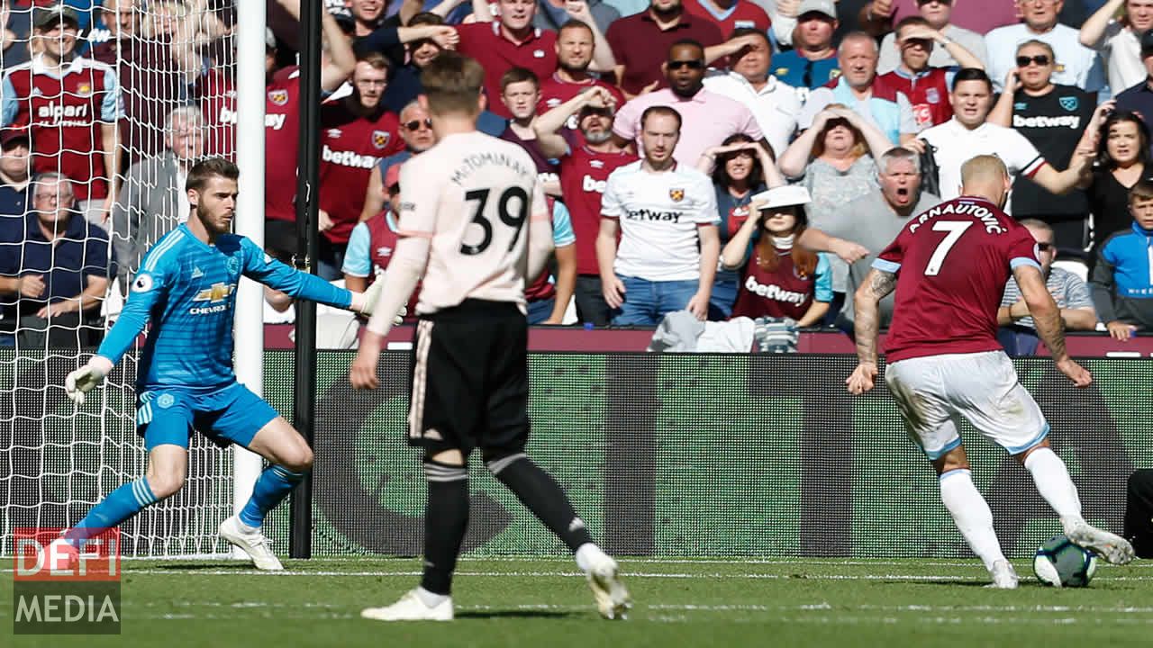 Les hommes de Manuel Pellegrini en profitaient au pire moment. Juste avant la pause, Yarmolenko envoyait une frappe sans grande conviction, qui, déviée par Lindelöf, allait se loger directement dans la lucarne de De Gea (43).