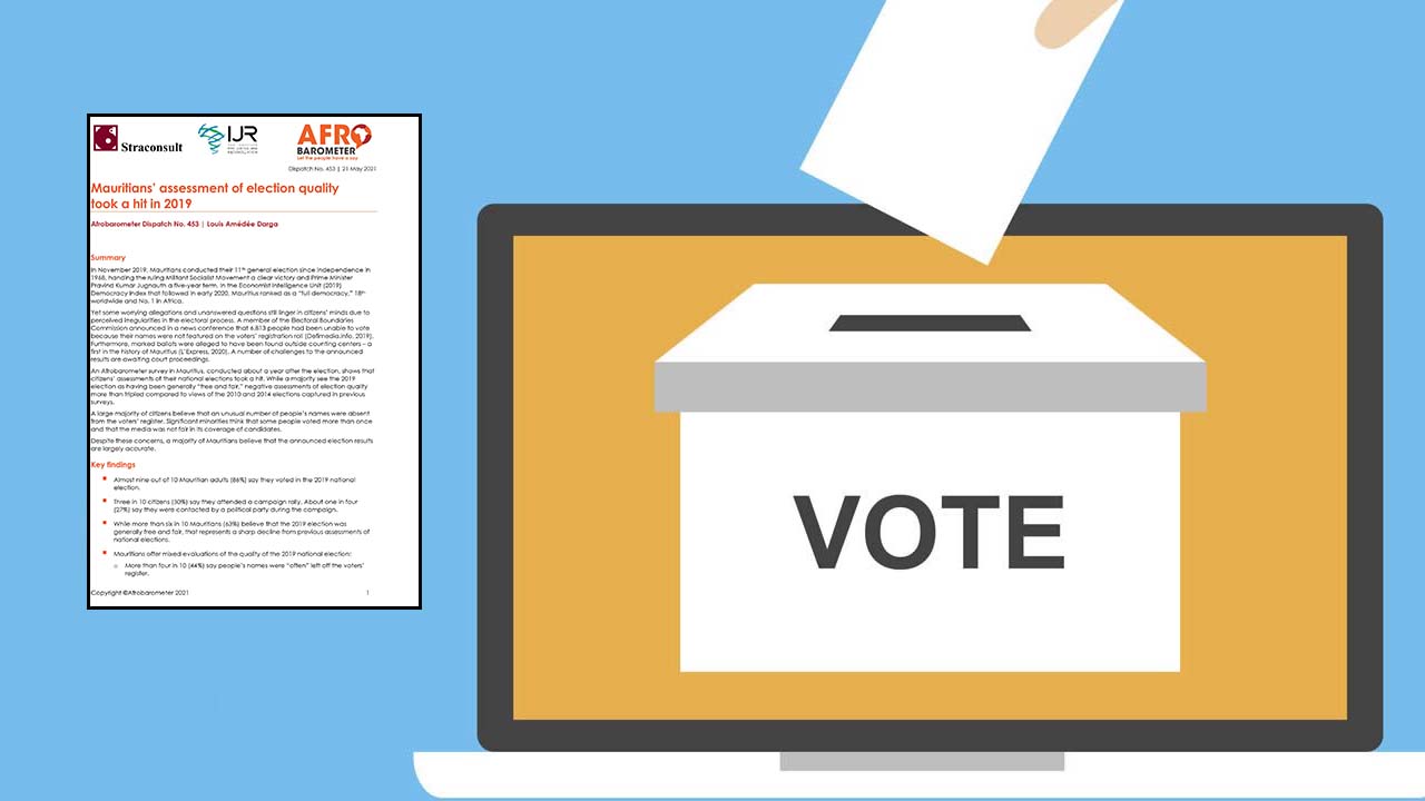 Par rapport aux élections législatives 2019, plus de 4 sur 10 Mauriciens (44 %) indiquent que souvent les noms des votants ne figuraient pas dans la liste électorale. Et un sur 4 (27 %) estiment que certaines personnes ont voté plus d’une fois. Ce sont les conclusions d'une étude réalisée par Afrobarometer auprès d’un échantillon de 1200 Mauriciens adultes en novembre 2020. Ce sondage fait aussi état qu’environ neuf sur 10 Mauriciens (87 %) affirment d’avoir voté pour les élections législatives en 2019. Tandis que trois sur dix citoyens (30%) indiquent qu’ils ont assisté à des campagnes électorales.