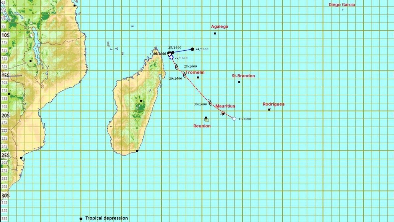 Prévisions de trajectoire du système qui s'est intensifié en dépression tropicale durant la nuit. Elle sera baptisée Gamane. Selon les prévisions de la station météorologique de Vacoas, Gamane pourrait passer directement sur Maurice entre le 30 et le 31 mars 2024.