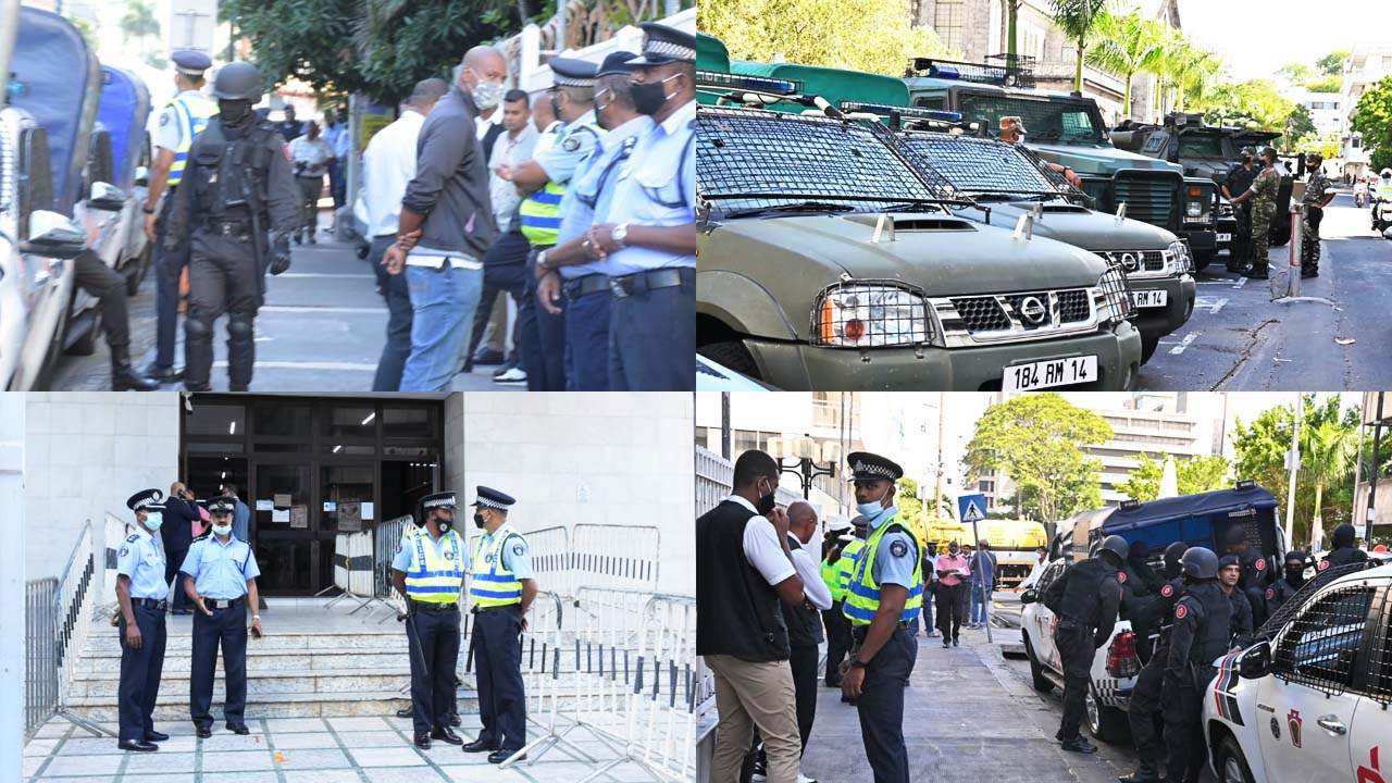 Important dispositif de la police, notamment des éléments de la Special Support Unit (SSU) ainsi que ceux de la Special Mobile Force (SMF), devant la New Court House ce jeudi matin 7 janvier. Cela, dans le cadre de la comparution du ministre du Commerce, Yogida Sawmynaden devant le tribunal de Port-Louis dans le cadre de la Private Prosecution logée contre lui par la veuve de Soopramanien Kistnen.