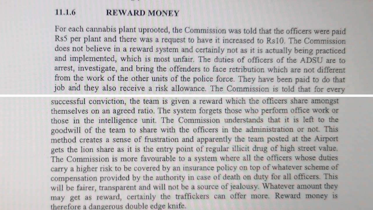 Le rapport de la commission d'enquête sur la drogue présidée par l'ancien juge Paul Lam Shang Leen précise d'ailleurs que le ‘Reward Money’ doit être accordé à tous les officiers de l’Adsu. « The Commission is told that for every successful conviction, the team is given a reward which officers share amongst themselves on an agreed ratio. The system forgets those who perform office work or those in the intelligence unit. The Commission understands that it is left to the goodwill of the team to share with the officers in the administration or not. This method creates a sense of frustration (…) The Commission is more favorable to a system where all the officers whose duties carry a higher risk to be covered by an insurance policy on top of whatever scheme of compensation provided by the authority in case of death on duty for all officers (…) Whatever amount they get as reward, certainly the traffickers can offer more. Reward Money is therefore a dangerous double edge knife », stipule le rapport.