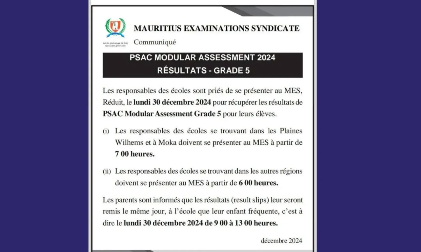 Les responsables des écoles doivent se rendre au Mauritius Examinations Syndicate (MES), à Réduit, pour récupérer les résultats. Ceux des écoles situées à Plaines Wilhems et Moka sont attendus à partir de 7 h, tandis que ceux des autres régions pourront s’y rendre dès 6 h.