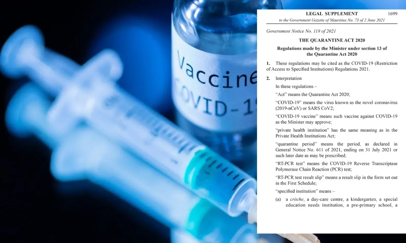 Cette mesure entre en vigueur à partir du 21 juin prochain. Tout individu non-vacciné alors que sa santé le lui permet et qui se trouve dans une institution mentionnée risquera une amende de Rs 500 000 et une peine d’emprisonnement de dépassant pas cinq ans.