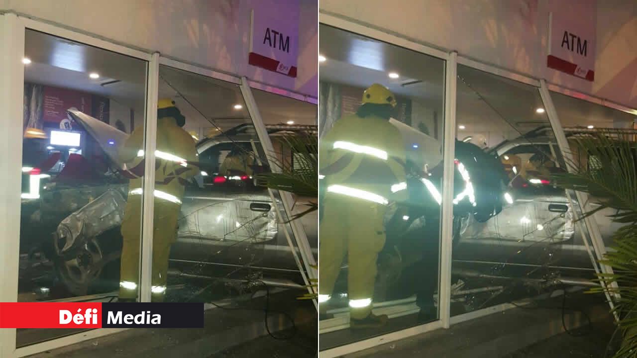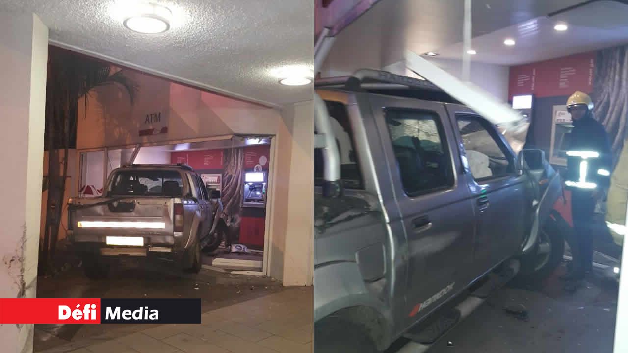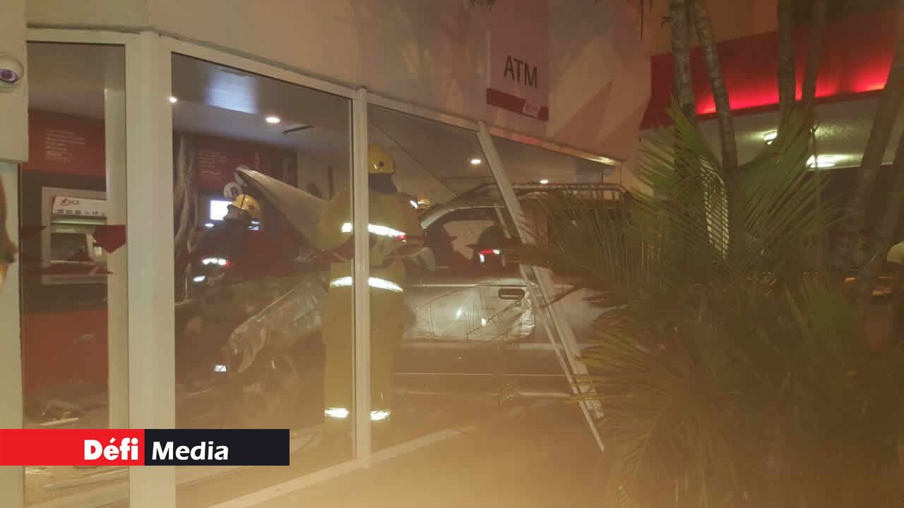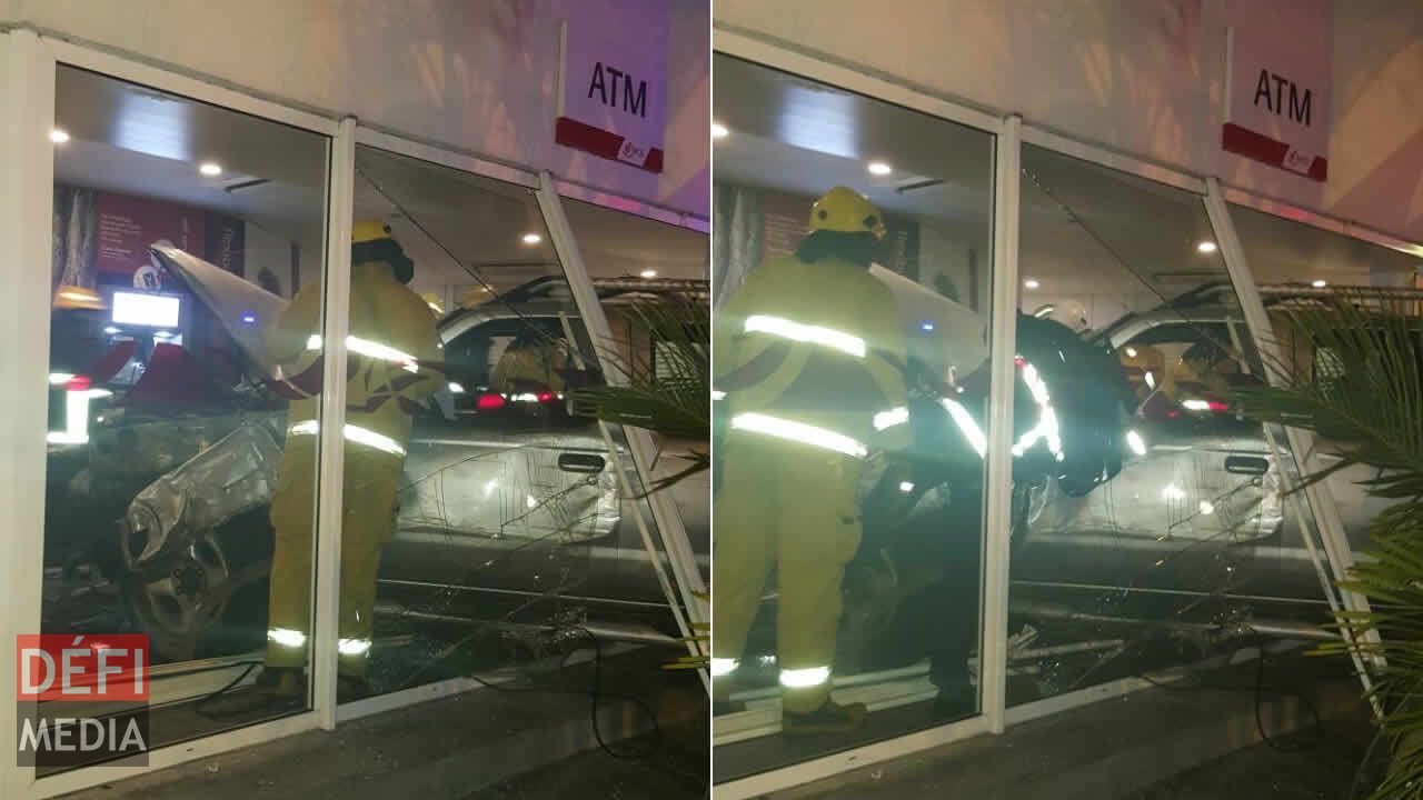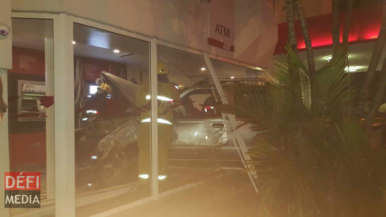 Un 4x4 s’est encastré dans la baie vitrée d’une pièce où se trouvent les guichets automatiques [ATM] de la Mauritius Commercial Bank (MCB).