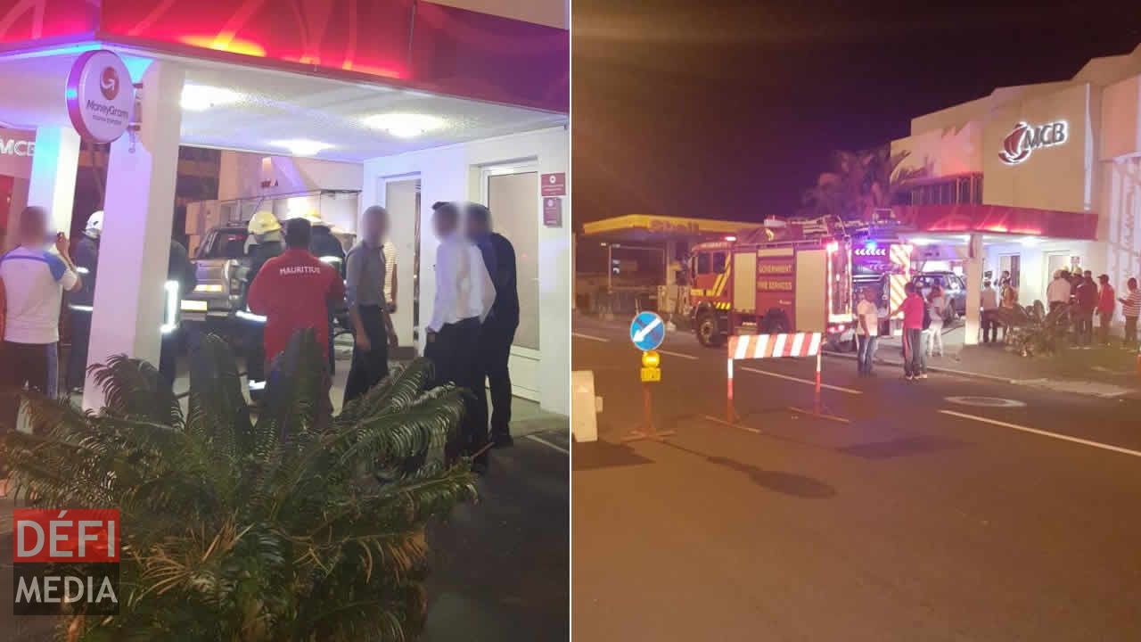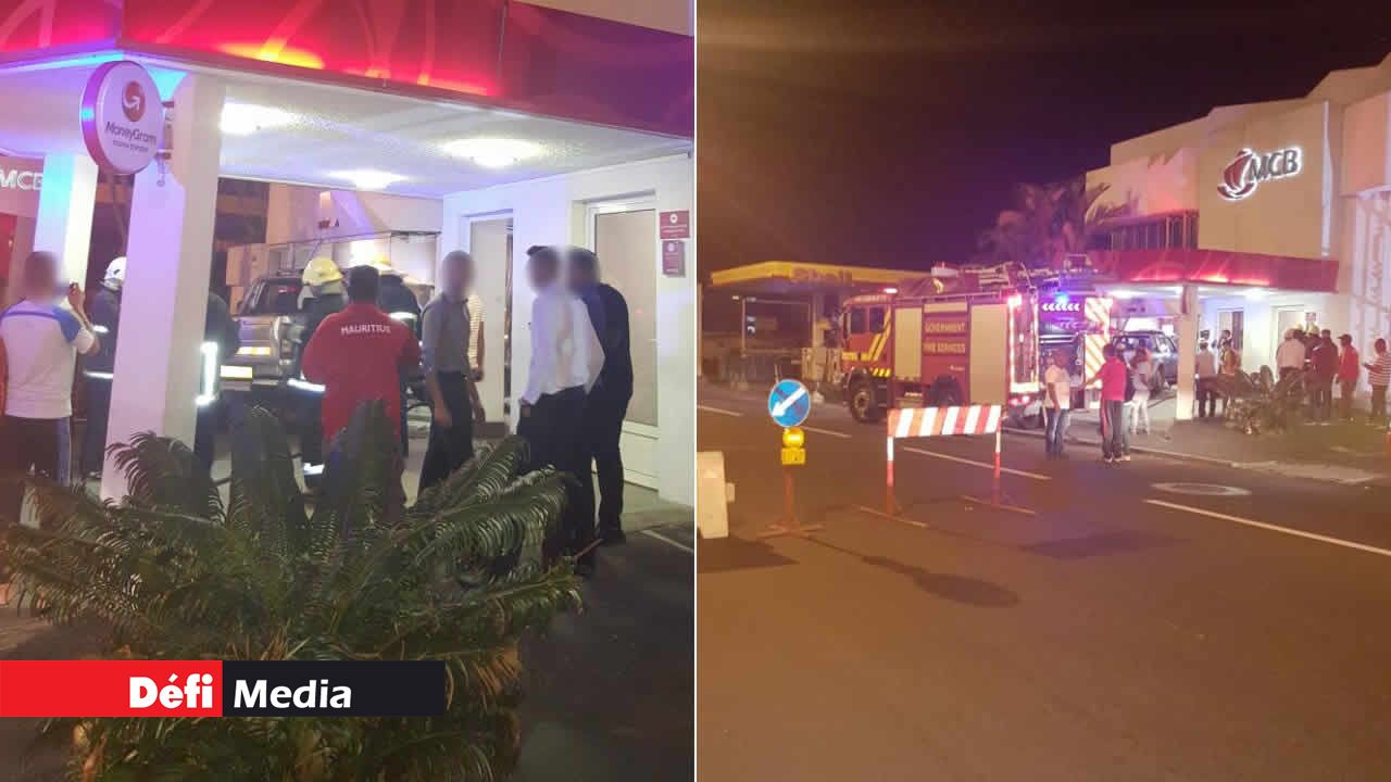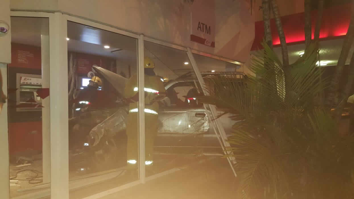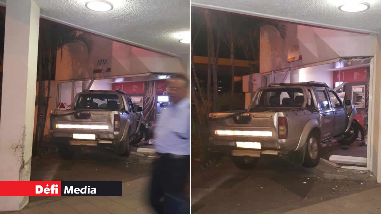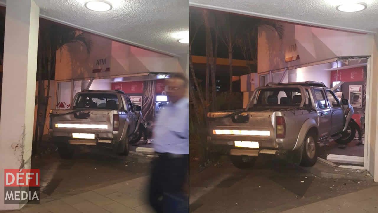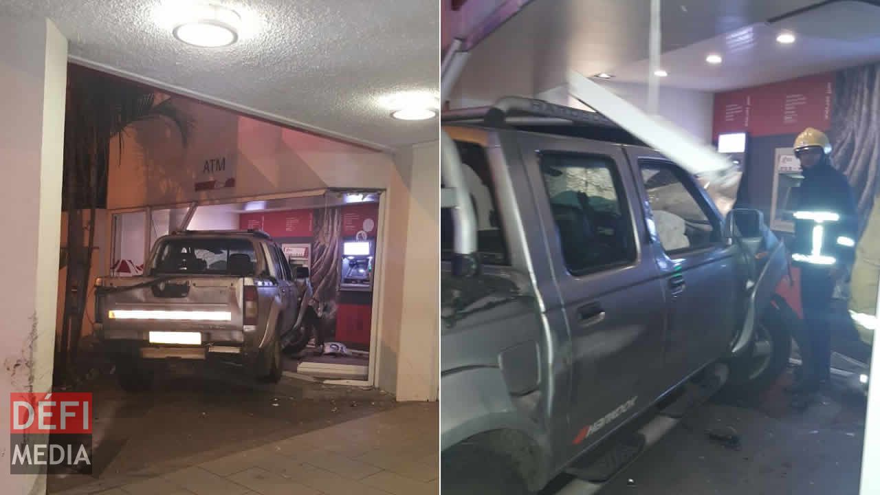 Un 4x4 s’est encastré dans la baie vitrée d’une pièce où se trouvent les guichets automatiques [ATM] de la Mauritius Commercial Bank (MCB).