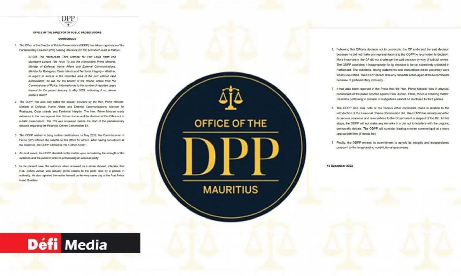 Le bureau du DPP, dans un communiqué émis ce mercredi, affirme que les critiques, déclarations et insinuations faites hier au Parlement, lors d'une réponse du Premier ministre, Pravind Jugnauth, sur le député travailliste Eshan Juman, à la suite d'une interpellation de la députée MSM du no 3, Joanne Tour, sont «totalement injustifiées». Autre point évoqué dans le communiqué : le Financial Crimes Commission Bill. Le bureau du DPP dit avoir déjà fait part au gouvernement ses «préoccupations et réserves» en ce qui concerne le projet de loi. Ci-dessous le communiqué du bureau du DPP :