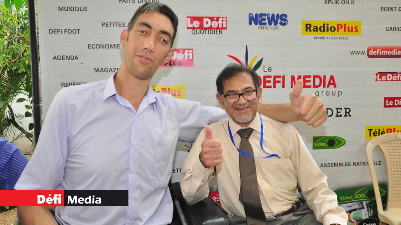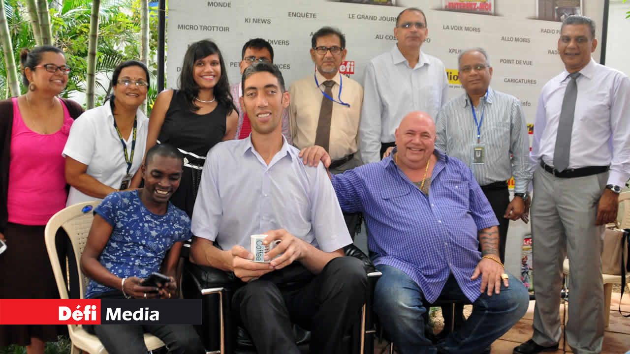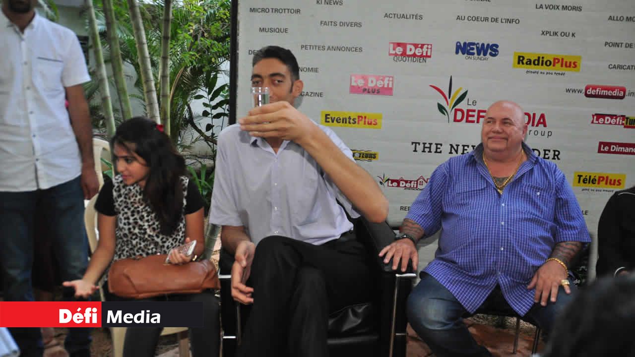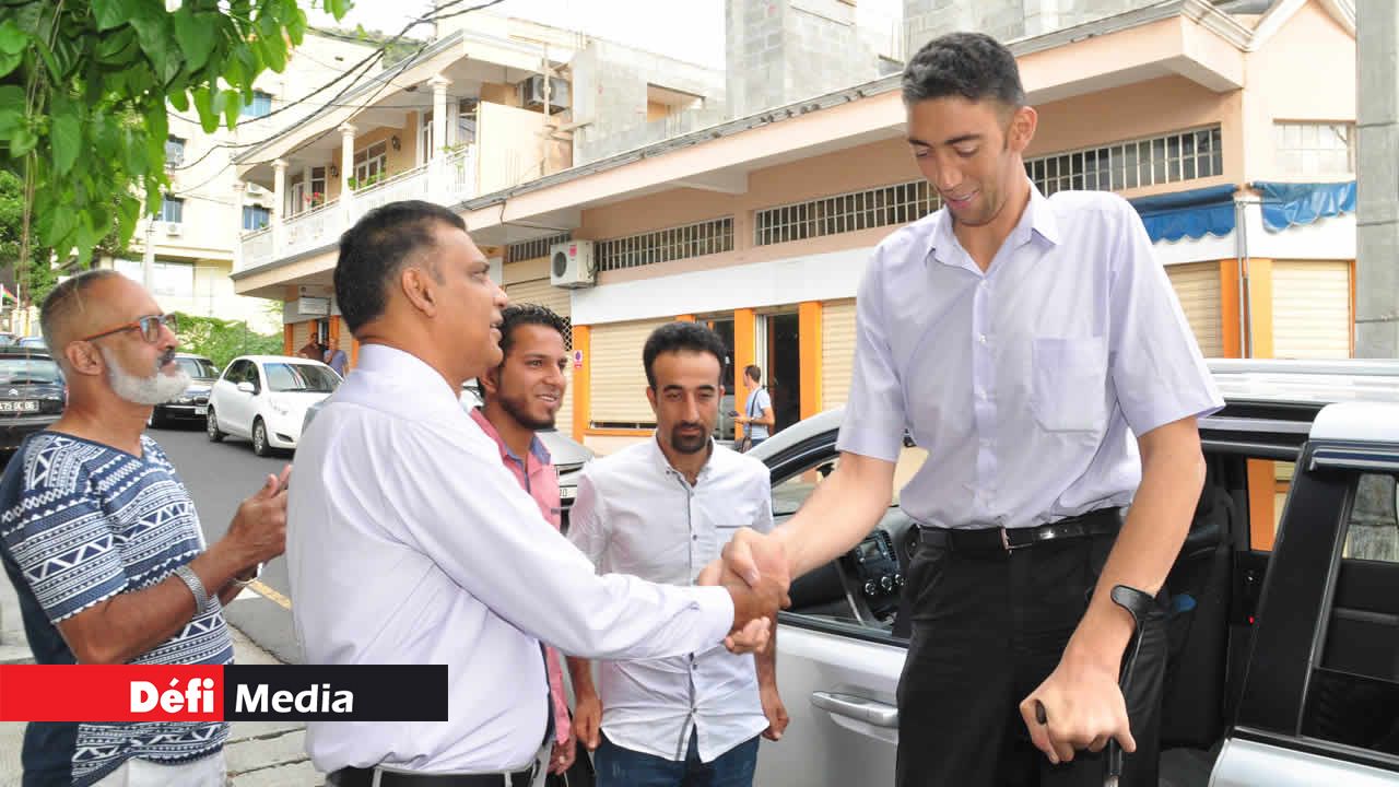 Un visiteur de marque dans les locaux de Radio Plus jeudi matin 14 avril. Sultan Kösen, homme le plus grand de la planète, a visité la station de la rue Labourdonnais.
