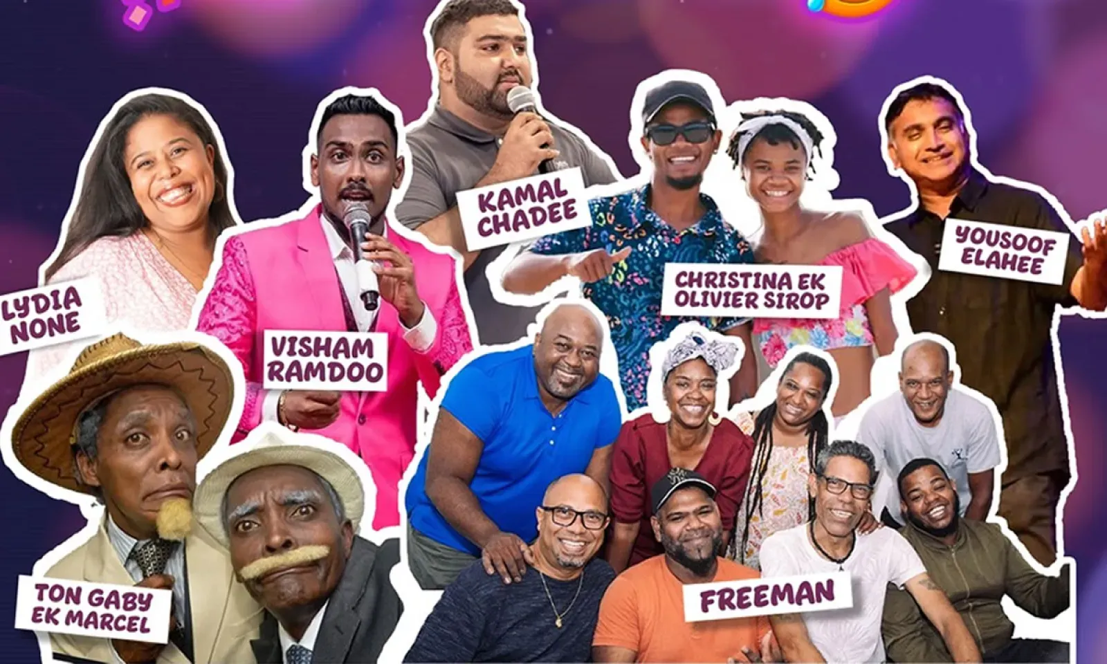 Le plateau réunira : Visham Ramdoo, Ton Gaby et Ton Marcel, Lydia None, Kamal Chadee, le groupe Freeman, Olivier et Christina Sirop et Yousoof Elahee. Ces talents partageront une série de sketches, d’anecdotes et d’observations mordantes.
