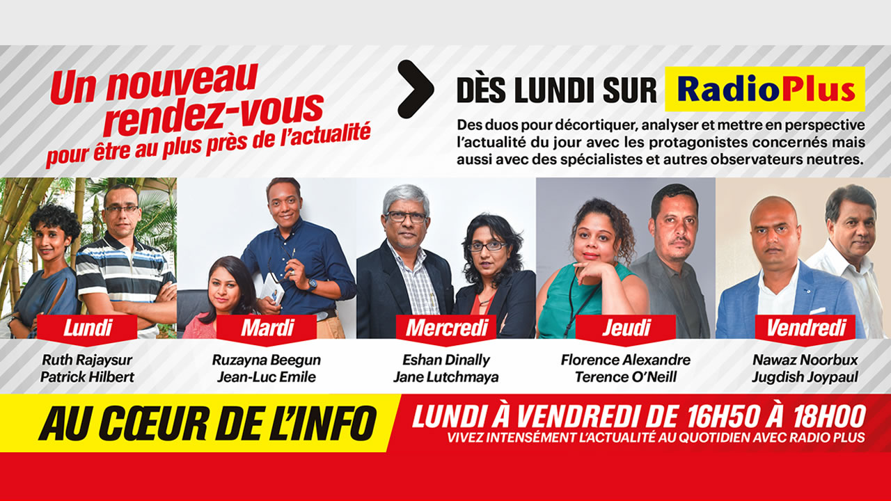 Des tandems composés de journalistes du Défi Media Group et de Radio Plus se passeront le relais chaque jour. Les lundis, retrouvez Patrick Hilbert et Ruth Rajaysur, les mardis Jean-Luc Émile et Ruzayna Beegun, les mercredis Jane Lutchmaya et Eshan Dinally, les jeudis Florence Alexandre et Terence O’Neill et les vendredis Jugdish Joypaul et Nawaz Noorbux.