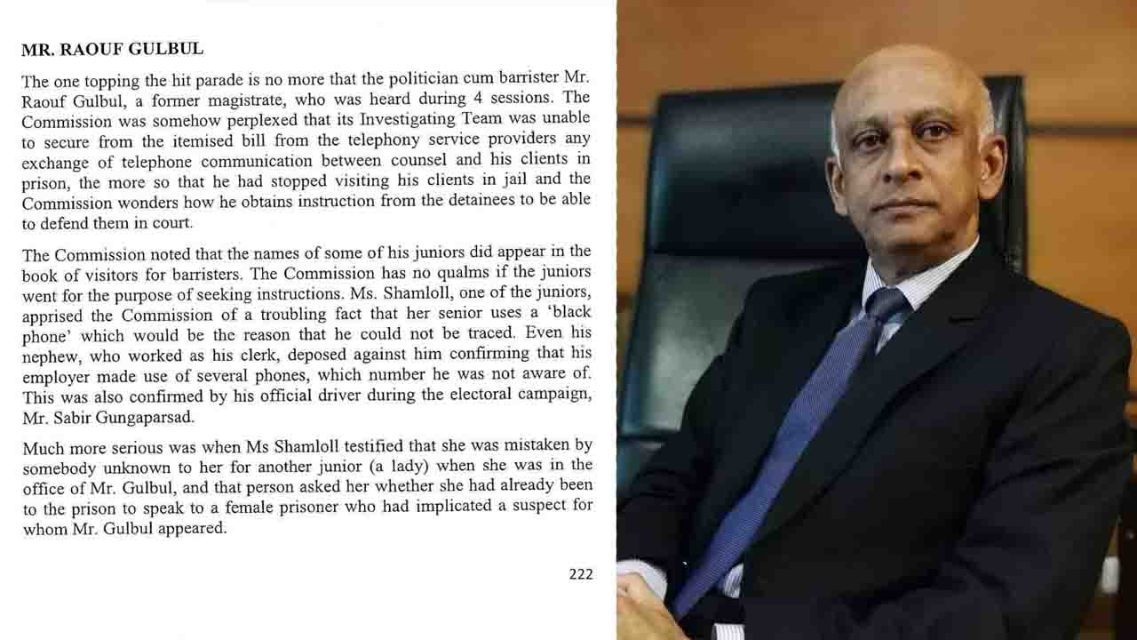 «In the light of the above, the Commission considers that there are matters of concern. If those facts are proved after enquiry to be exact, Mr Gulbul might have committed numerous offences like subordination of witnesses, laundering money, accepting cash above unauthorised amount. Consequently, the Commission recommends that an in-depth inquiry and audit trail be carried out into the affairs of Mr Raouf Gulbul and the relevant authoritities to take whatever appropriate action they may deem fit», écrivent le président de la Commission d'enquête et ses deux assesseurs.