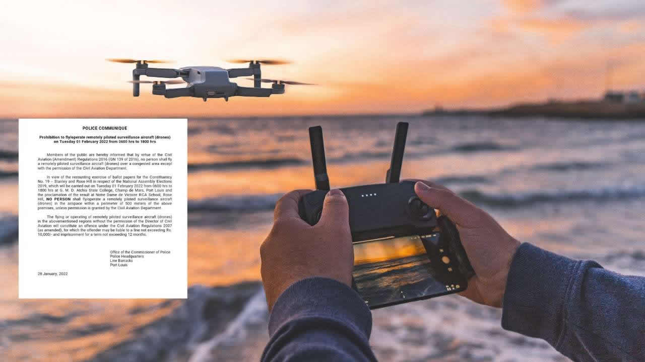 L’exercice de « recount » des bulletins de vote dans la circonscription n° 19 (Stanley/Rose-Hill) aura lieu ce mardi 1ᵉʳ février. À cet effet, il sera interdit de faire voler ou d’utiliser un drone dans l’espace aérien situé dans un périmètre de 500 m autour des locaux suivants : G.M.D Atchia State College, qui se trouve près du Champ-de-Mars, Port-Louis (où aura lieu le recomptage des bulletins de vote) et Notre Dame de Victoire RCA School, Rose-Hill (où aura lieu la proclamation des résultats) sauf si une autorisation est accordée par le département de l'aviation civile.