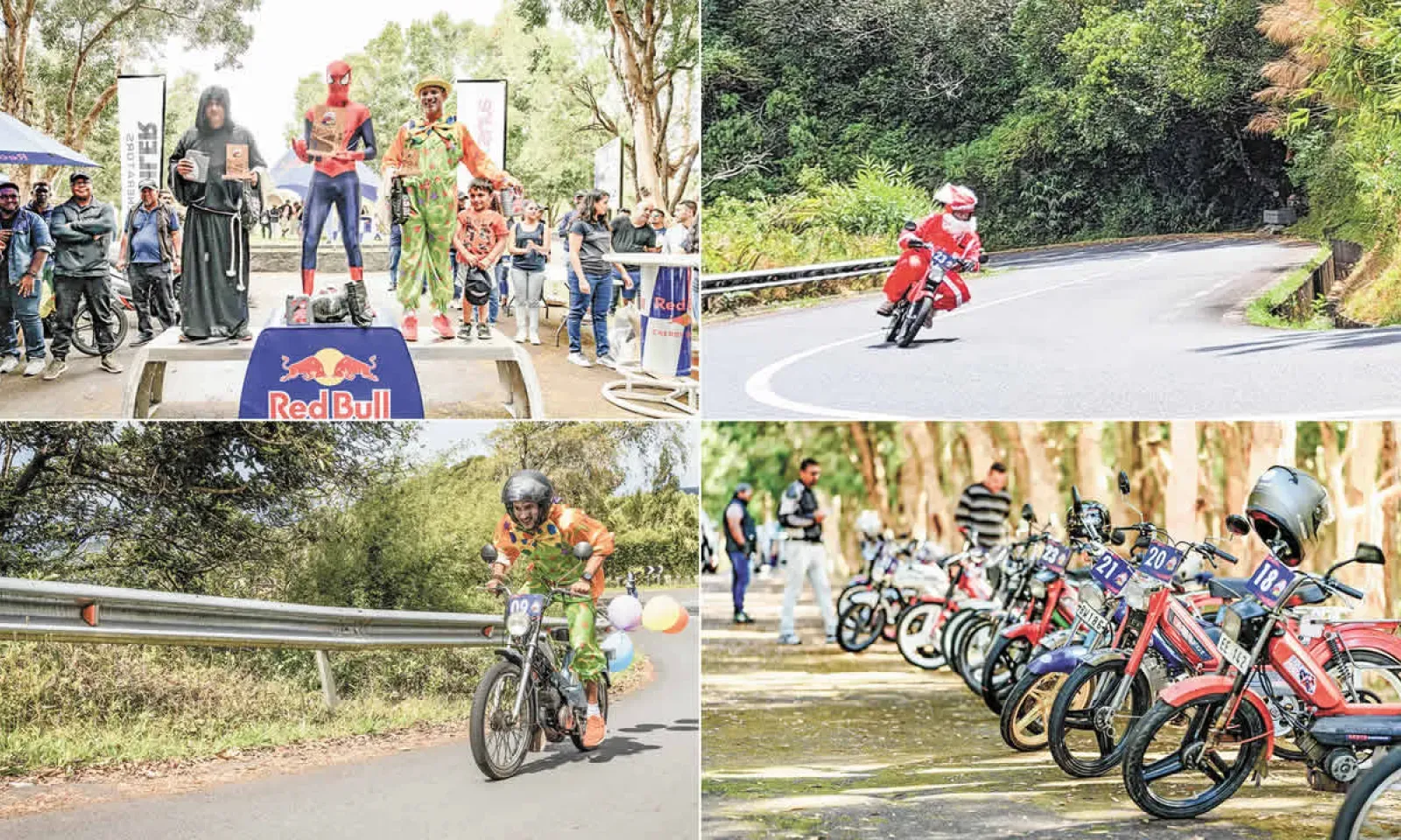 En 2022, c’est Grégory Passée, déguisé en Spiderman, qui a dompté les pentes de la mythique montée de Chamarel- Plaine-Champagne sur Peugeot P50. Mike Lutchman (moine) sur Peugeot 103 et Frédéric Passée (clown), pilotant une MBK, ont complété le podium, prouvant que l’esprit fun et la compétition font bon ménage dans cette course hors du commun organisé par Red Bull avec le soutien technique de la Team RC Motorsports.