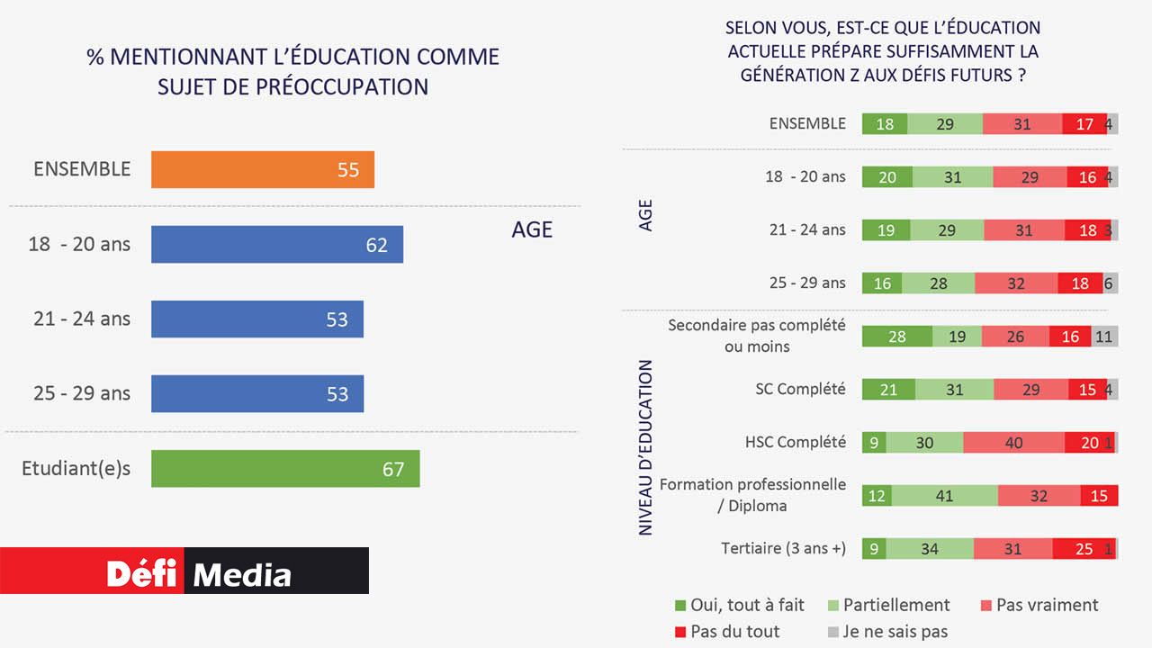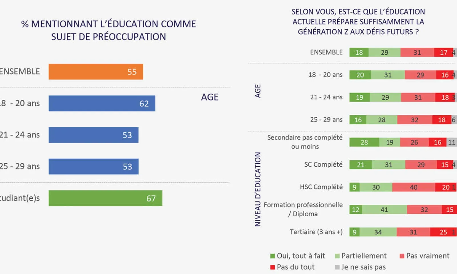 Selon les résultats, 55 % des jeunes interrogés placent l’éducation en tête de leurs préoccupations. Ce chiffre grimpe à 63 % chez les 18-20 ans et à 67 % chez les étudiants. Pourtant, seuls 18 % de l’ensemble des répondants estiment que le système éducatif prépare efficacement la génération Z aux défis futurs. Près de la moitié (49 %) pensent au contraire que l’éducation ne les prépare pas, ou peu, à affronter les réalités du monde professionnel.