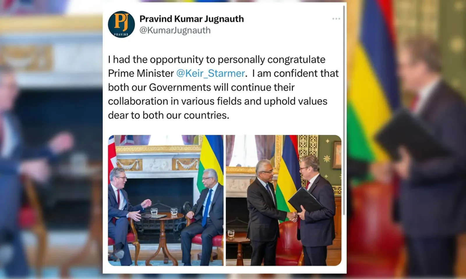 « J'ai eu l'opportunité de féliciter personnellement le Premier ministre Keir Starmer. Je suis convaincu que nos deux gouvernements continueront leur collaboration dans divers domaines et défendront les valeurs chères à nos deux pays », a écrit le Premier ministre, Pravind Jugnauth sur son compte X (ex-twitter), ce mercredi 24 juillet.
