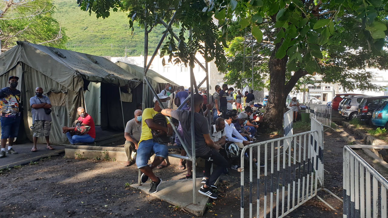 « Depi 5h30 monn vini. Ti ankor pe fer nwar ». C’est ce que nous répond un homme, âgé d’une cinquantaine d’années, assis sur un tabouret pliant à l’extérieur des Casernes centrales. Il est à ce moment-là aux alentours de 7 heures. Alors que l’exercice ne débutera qu’à 8 heures, ils sont déjà presque une centaine de personnes, debout sur le trottoir donnant sur la rue Lord Kitchener.