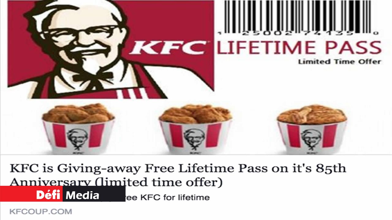 De faux coupons de promotion faisant croire à leurs détenteurs qu’ils ont remporté des repas gratuits à vie dans les restaurants Kentucky Fried Chiken (KFC) circulent sur internet, notamment sur le réseau social Facebook.