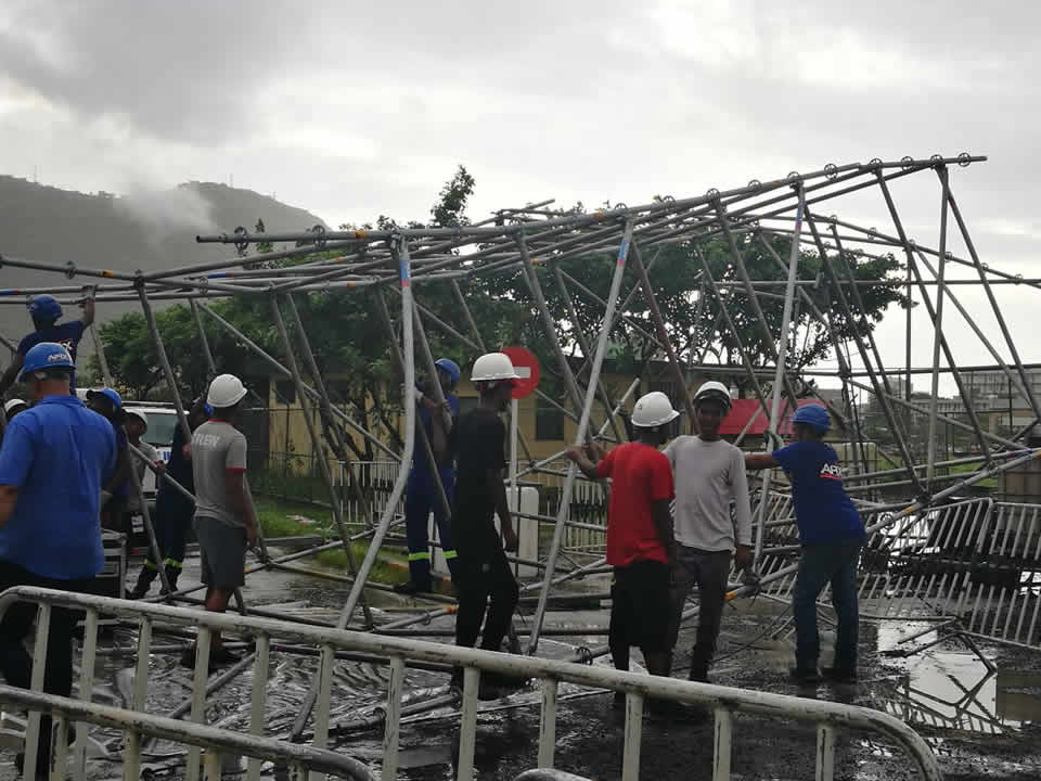 Un échafaudage s’est écroulé alors que des éléments de la force policière participaient aux répétitions pour le défilé des célébrations de l’Indépendance au Champ-de-Mars ce mardi 6 mars. Selon des témoins, l’échafaudage s’est écroulé à cause des vents forts et du mauvais temps.Un véhicule a été endommagé. Heureusement, il n’y a pas de blessés à déplorer.