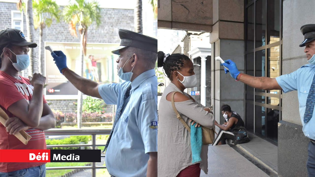 Ce vendredi 15 mai marque la reprise graduelle des activités dans plusieurs secteurs. Comme nous le démontrent ces images de notre photographe Rajenee Panchoo, devant la State Bank of Mauritius (SBM) Tower à la Place d’Armes, Port-Louis, ce vendredi matin, 15 mai, les clients sont soumis à une prise de température.