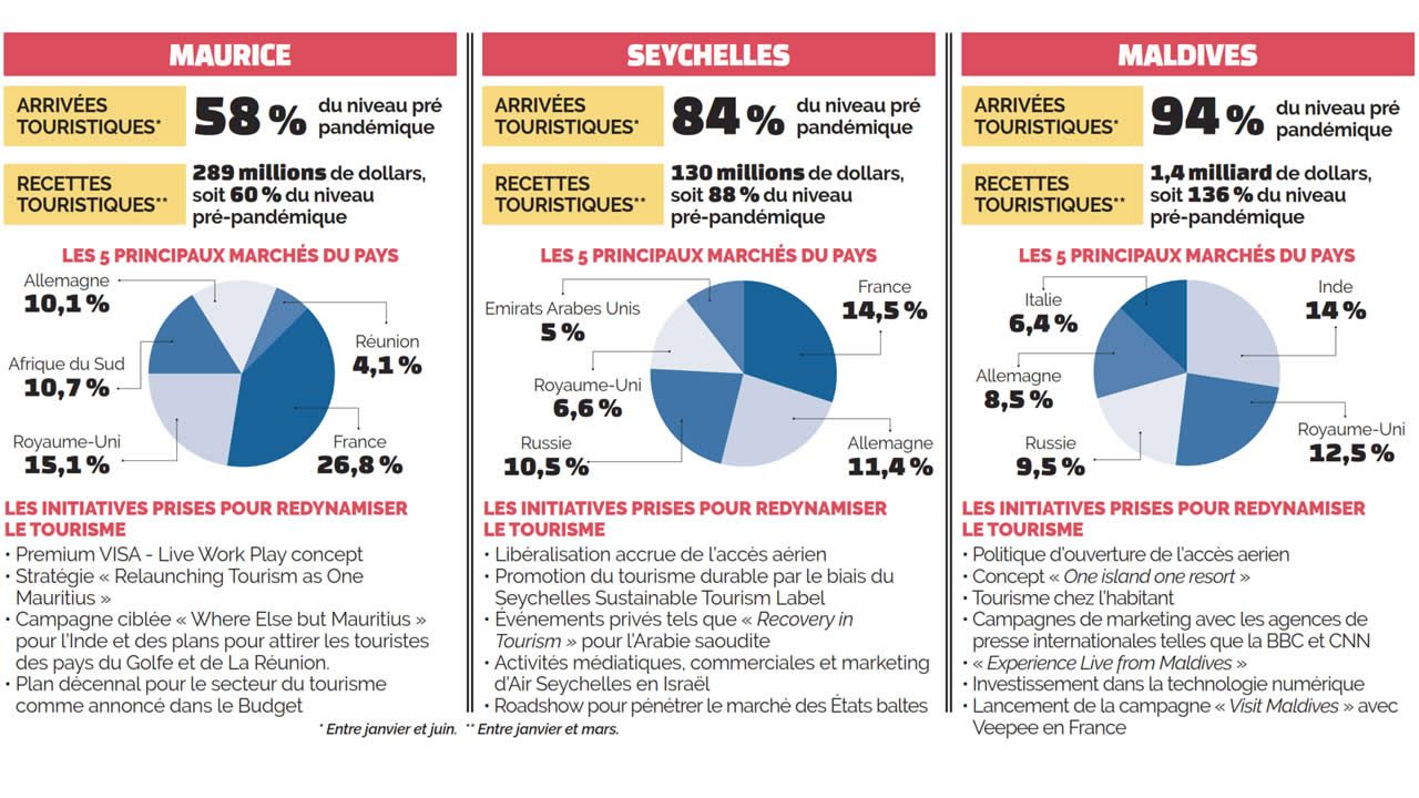 Les arrivées à Maurice se situaient, selon les estimations, à 58 % des niveaux de 2019 pendant la période janvier à juin 2022, indiquent les analystes de MCB Focus dans leur dernier rapport. A contrario, les Maldives et les Seychelles, qui avaient rouvert leurs frontières bien avant Maurice, ont retrouvé des niveaux proches de ceux d’avant la pandémie, soit à 94 % et 84 % respectivement pendant la même période. Cela, grâce, notamment, à une stratégie de diversification des marchés réussie.