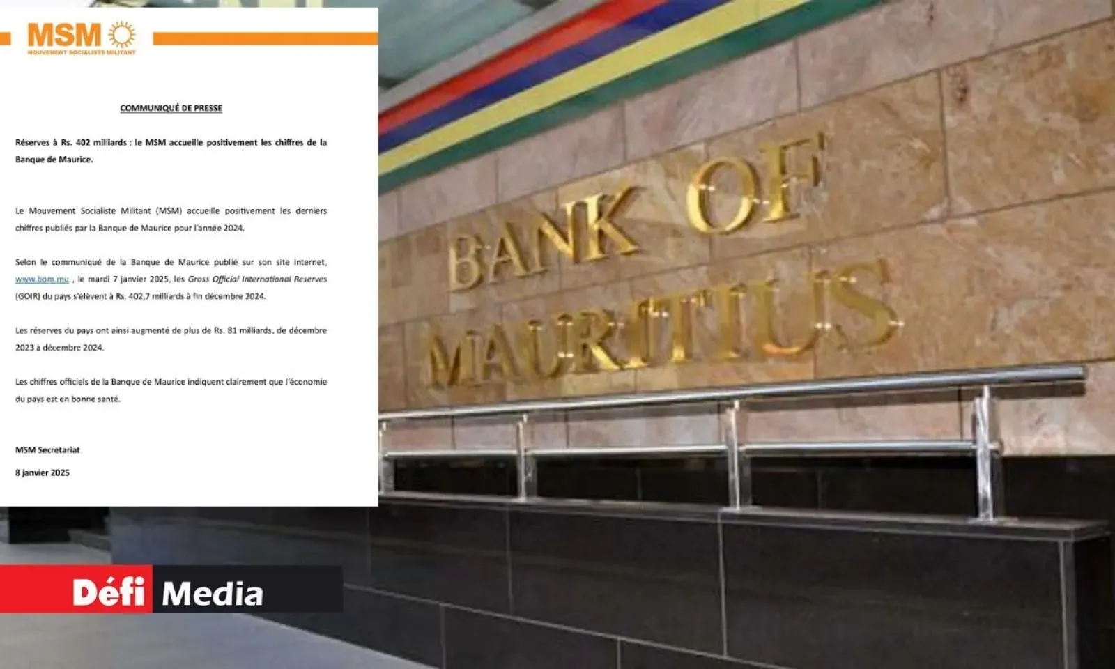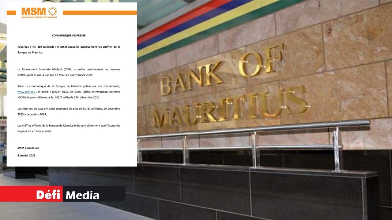Le Mouvement Socialiste Militant (MSM), dont le leader est Pravind Jugnauth, n’a pas tardé à réagir. Le parti Soleil dit « accueillir positivement les derniers chiffres publiés par la Banque de Maurice pour l’année 2024 ». « Les chiffres officiels de la Banque de Maurice indiquent clairement que l’économie du pays est en bonne santé », a écrit le secrétariat du MSM dans un communiqué de presse ce mercredi 8 janvier.