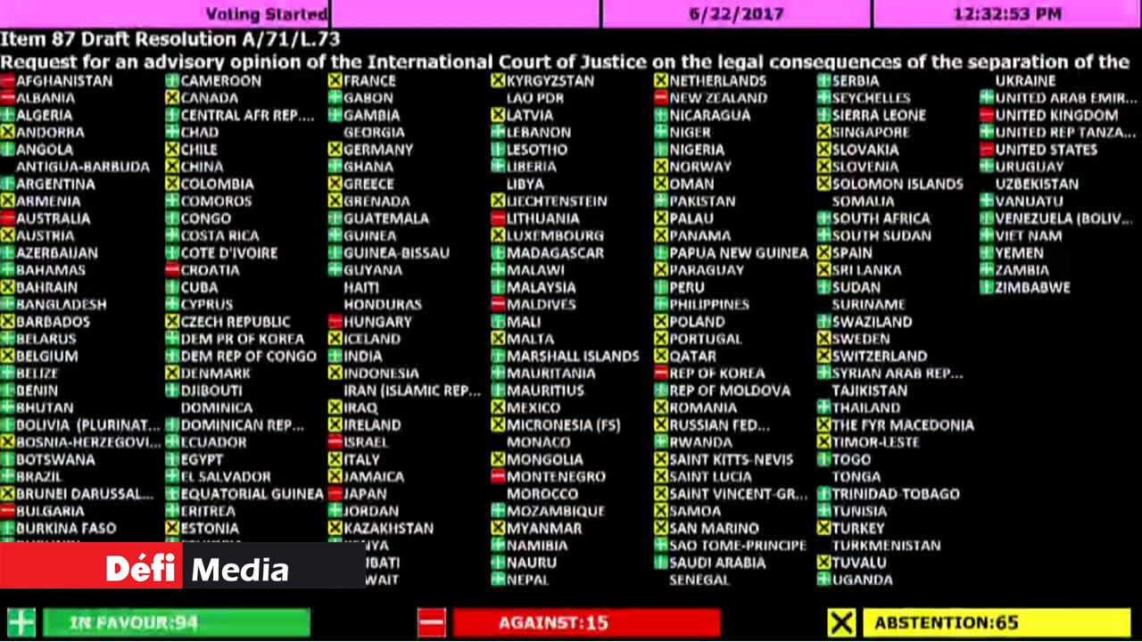 Les 15 États membres de l’Onu qui ont voté contre la résolution mauricienne sont : l’Albanie, l’Australie, l’Afghanistan, les Maldives, la Bulgarie, la Croatie, la Lituanie, la Hongrie, l’Israël, le Monténégro, la Nouvelle Zélande, la République de Corée, les États-Unis, le Royaume-Uni et le Japon.