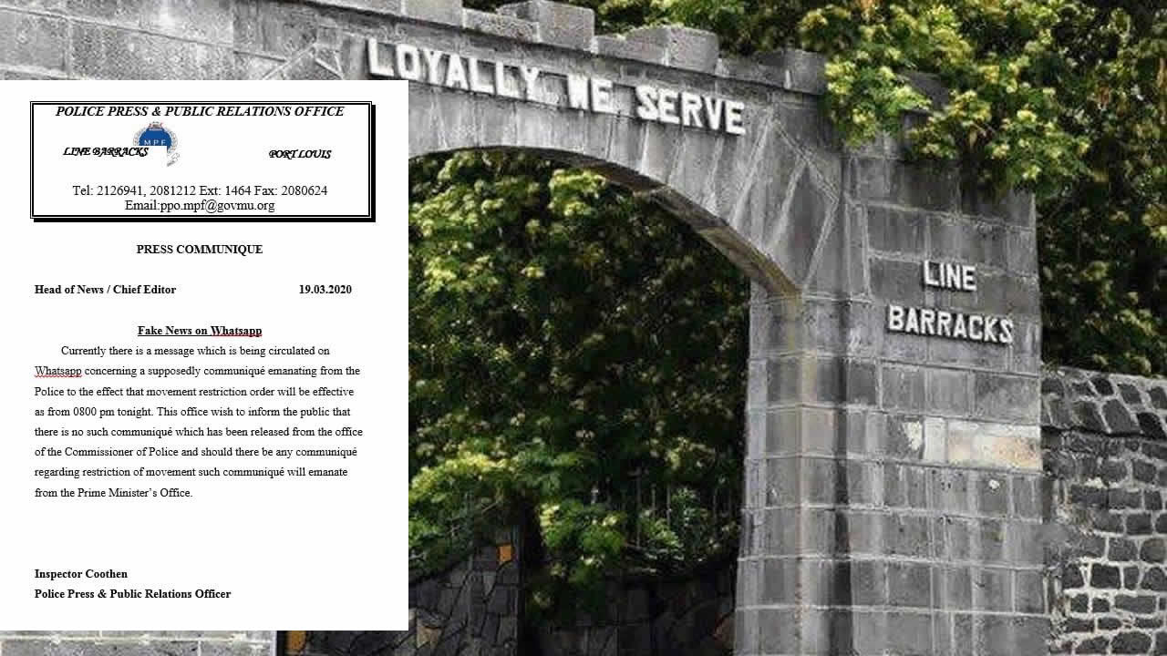 Le Police Press Office (PPO), dans un communiqué émis ce jeudi après-midi, parle de «fake news» après la circulation sur WhatsApp d'un «supposé communiqué». Communiqué qui annonce que des «restrictions de circulation» entreront en vigueur à Maurice à partir de 20 h ce jeudi.