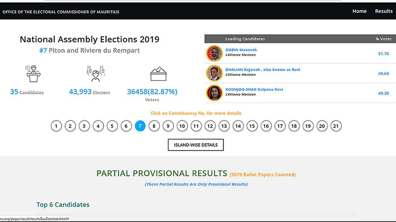Dans la circonscription du no 7 (Piton/Rivière-du-Rempart), l’Alliance Morisien est en tête sur 5 079 bulletins dépouillés après le premier pointage officiel de la Commission électorale. Les deux autres candidats de l'Alliance Morisien occupent la deuxième et troisième place.